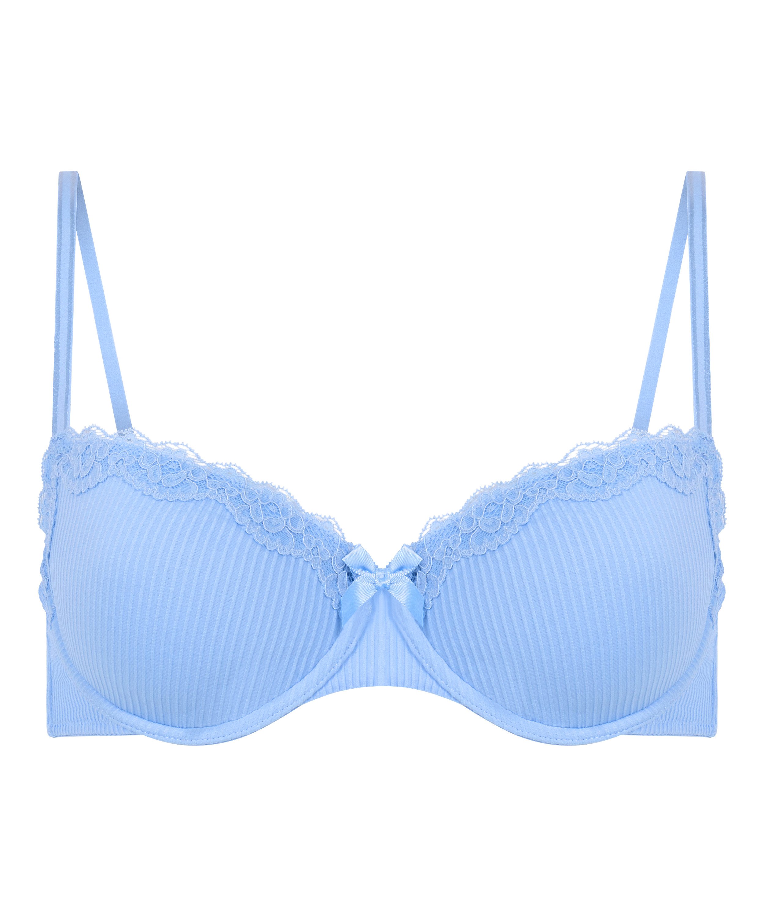 Denne polstrede BH-en er pyntet med blondedetaljer øverst på skålene. Mellom skålene finnes en liten sløyfe for et ekstra sexy utseende. Miks med de matchende tingene!