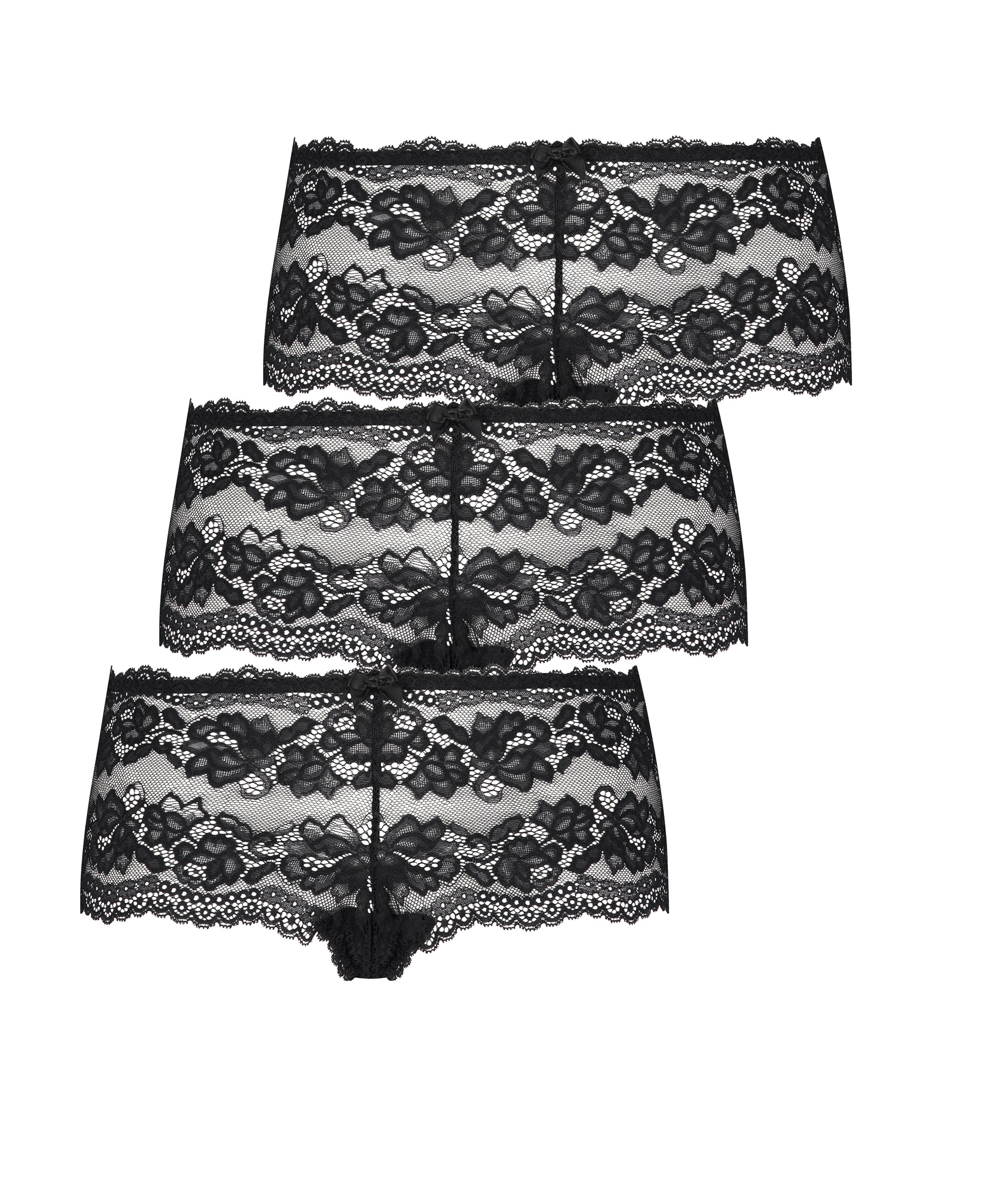 Føl deg sexy i disse boksertrusene! Bokserne er forseggjort med blonder over det hele og har en liten sløyfe. De er også praktisk pakket i en 3-pakning! Kombiner med en matchende BH!