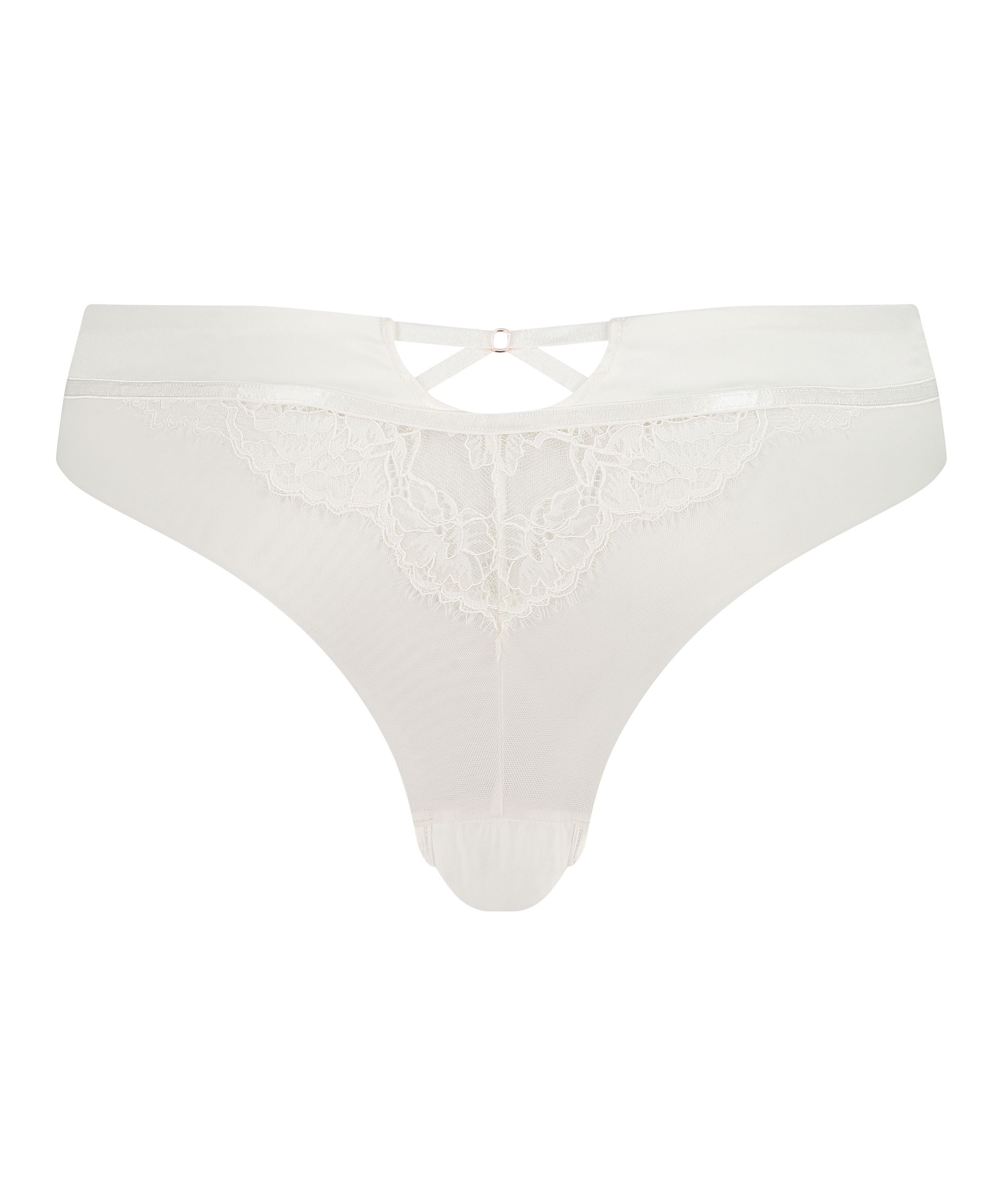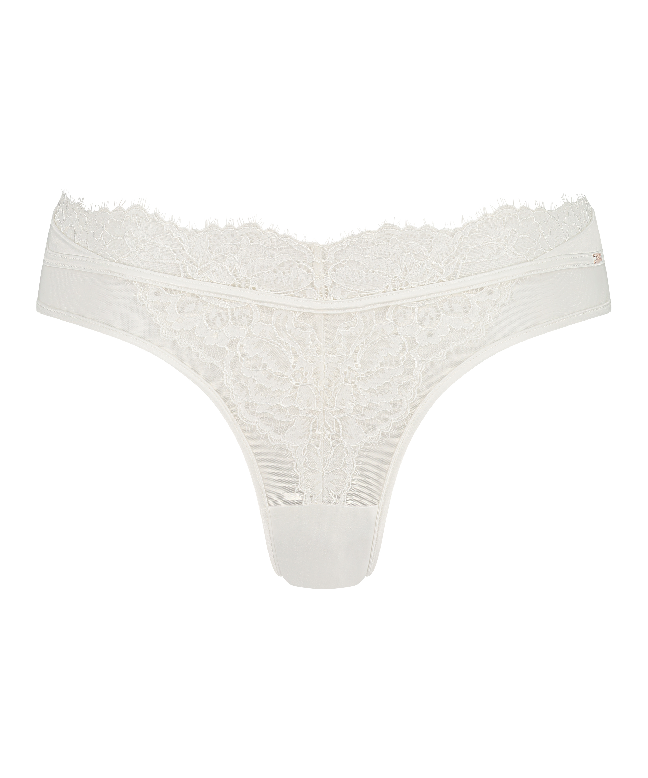 Føl deg komfortabel og elegant i denne brazilian-trusen! Den er halvgjennomsiktig og har romantiske blonder over det hele. Baksiden er i et sexy, nesten gjennomsiktig stoff. Prikken over i-en er den behagelige blondelinningen. Finn den matchende BH-en og få et komplett sett! En del av Noir-kolleksjonen.