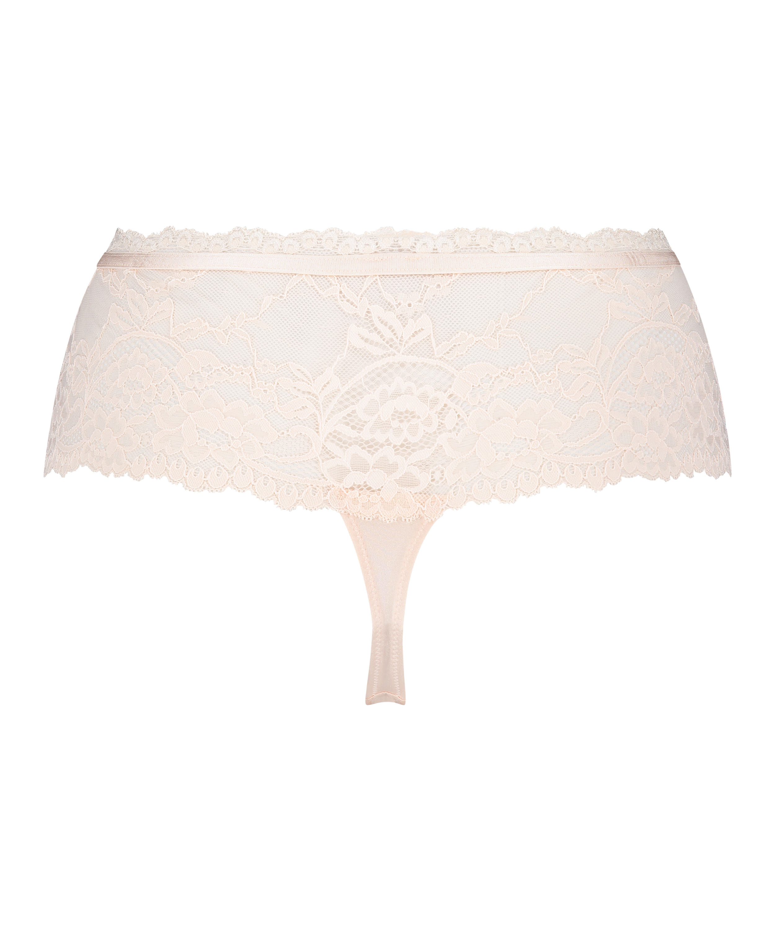 Føl deg sexy i denne hipster-stringen! Den er nesten fullt og helt av blonder og foran er det en søt, liten sløyfe. Dessuten går denne hipster-stringen litt høyere opp, noe som er veldig deilig. Denne stringtrusen er lett å kombinere med en matchende BH fra kolleksjonen vår.