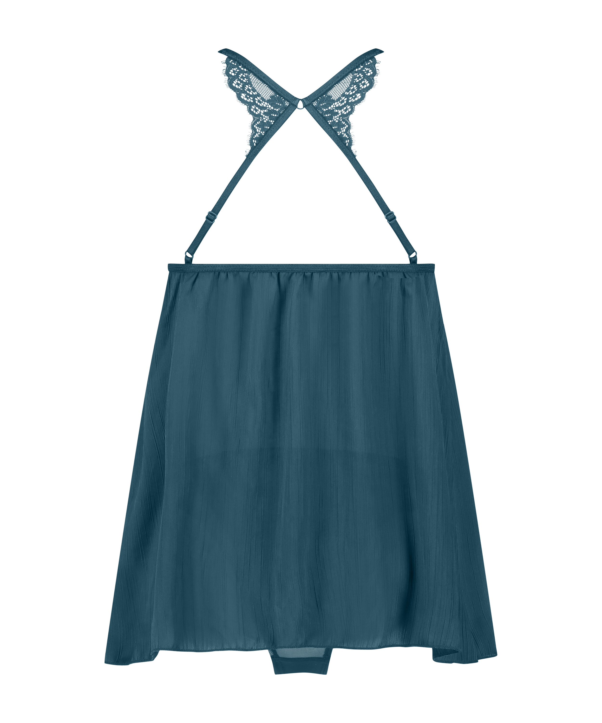 Kjenn seg sexy i denne babydollen! Den har romantiske blonder, lukking foran og stropper bak som går i kryss. Vi må ikke glemme at de matchende brazilian-trusene som hører til settet!