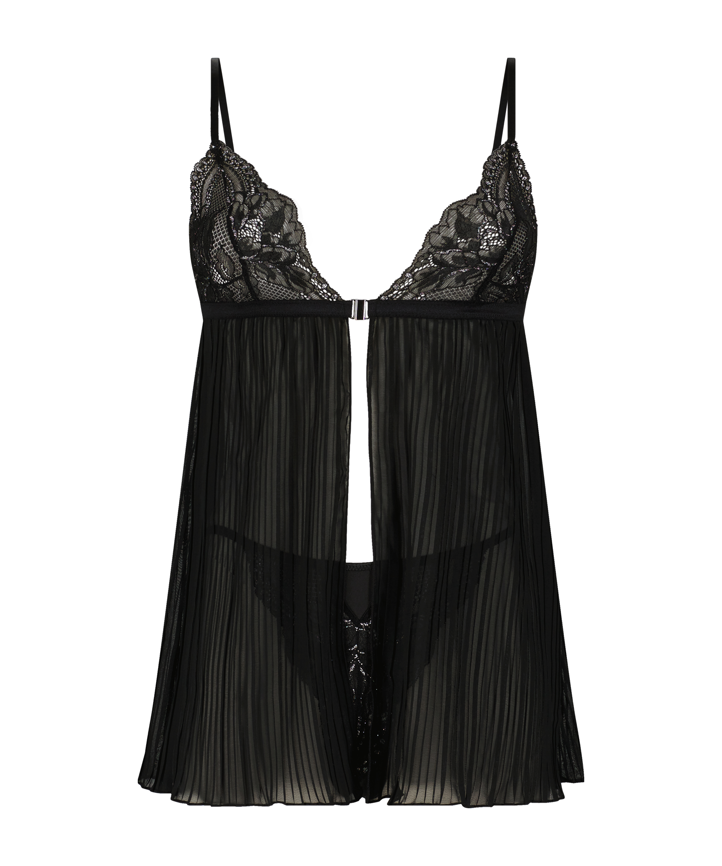 Sett et glamorøst preg på undertøysgarderoben din med denne vakre blonde babydollen! De luksuriøse blondene med sølvfargede detaljer og justerbare stropper er denne sexy babydollen en drøm å gli inn i. Den lukkes foran og kommer med en matchende brazilian-truse.