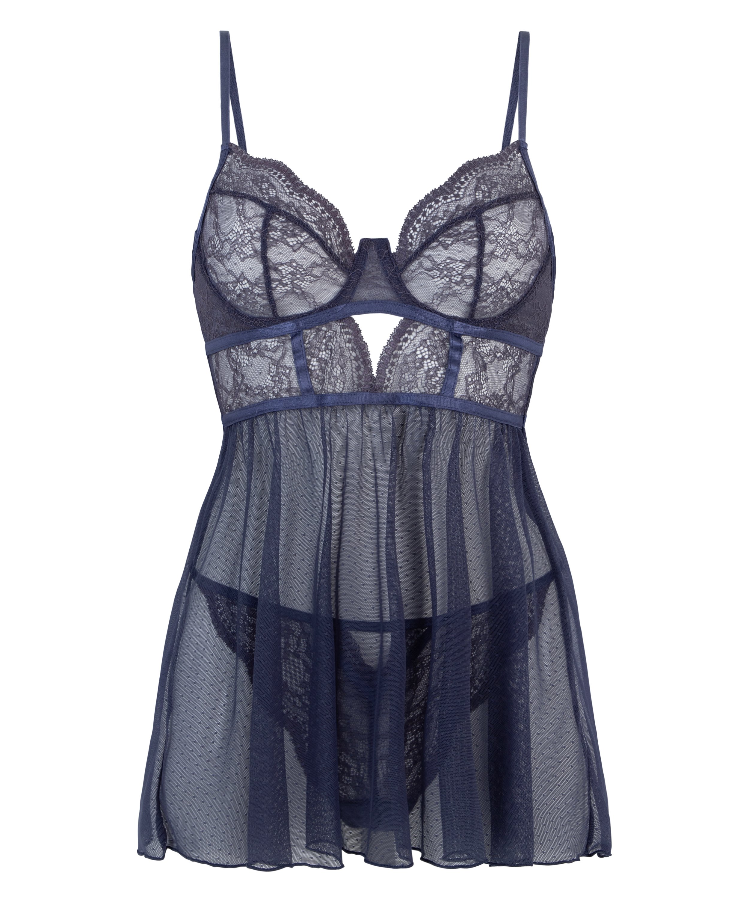 Kjenn seg sexy i denne babydollen! Med et romantisk blondeutseende, bøyler og bryst- og ryggkorsett for best mulig støtte. Vi må ikke glemme at de matchende brasilianske trusene hører til settet!