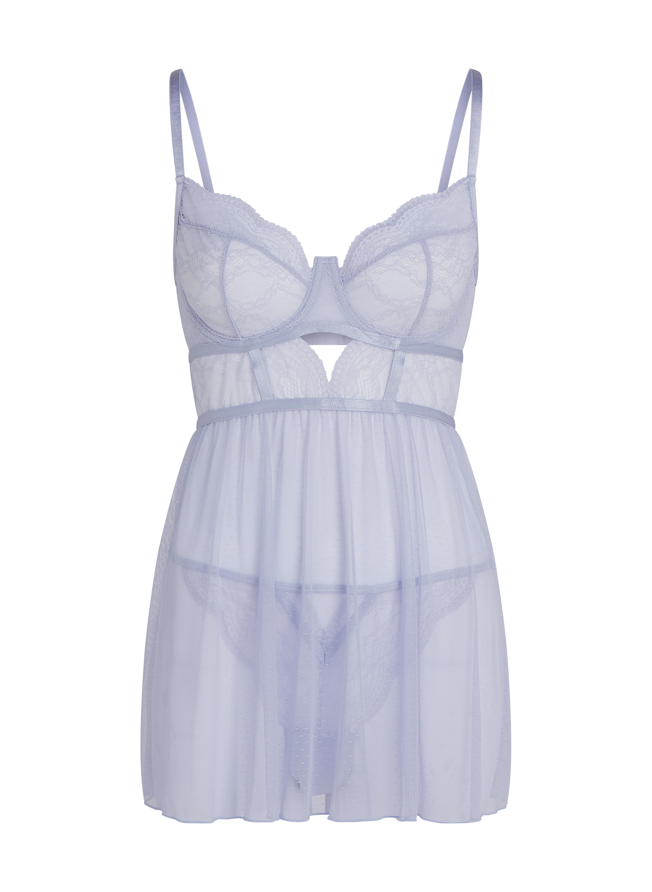 Kjenn seg sexy i denne babydollen! Med et romantisk blondeutseende, bøyler og bryst- og ryggkorsett for best mulig støtte. Vi må ikke glemme at de matchende brasilianske trusene hører til settet!