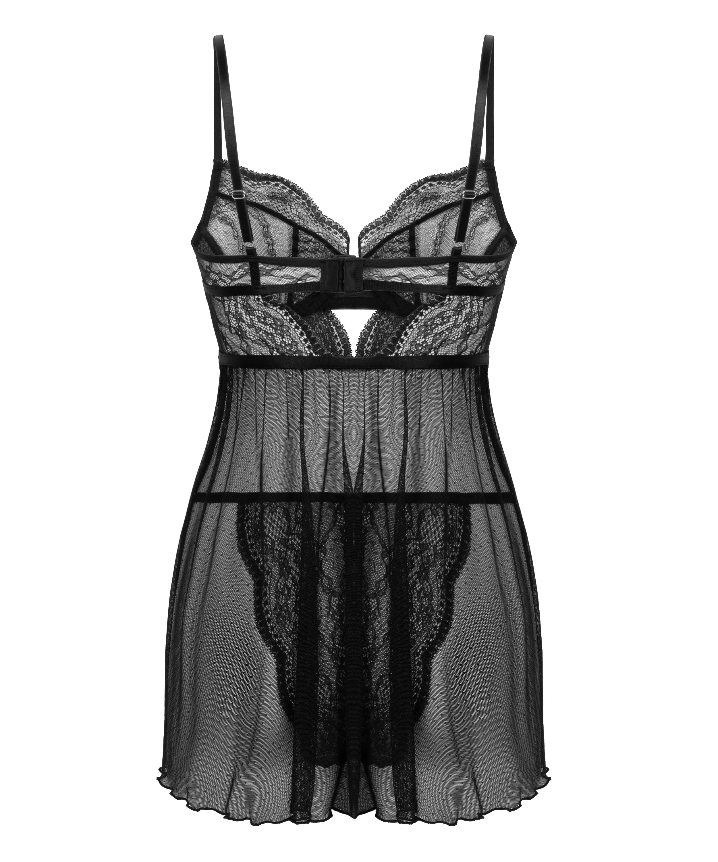 Kjenn seg sexy i denne babydollen! Med et romantisk blondeutseende, bøyler og bryst- og ryggkorsett for best mulig støtte. Vi må ikke glemme at de matchende brasilianske trusene hører til settet!