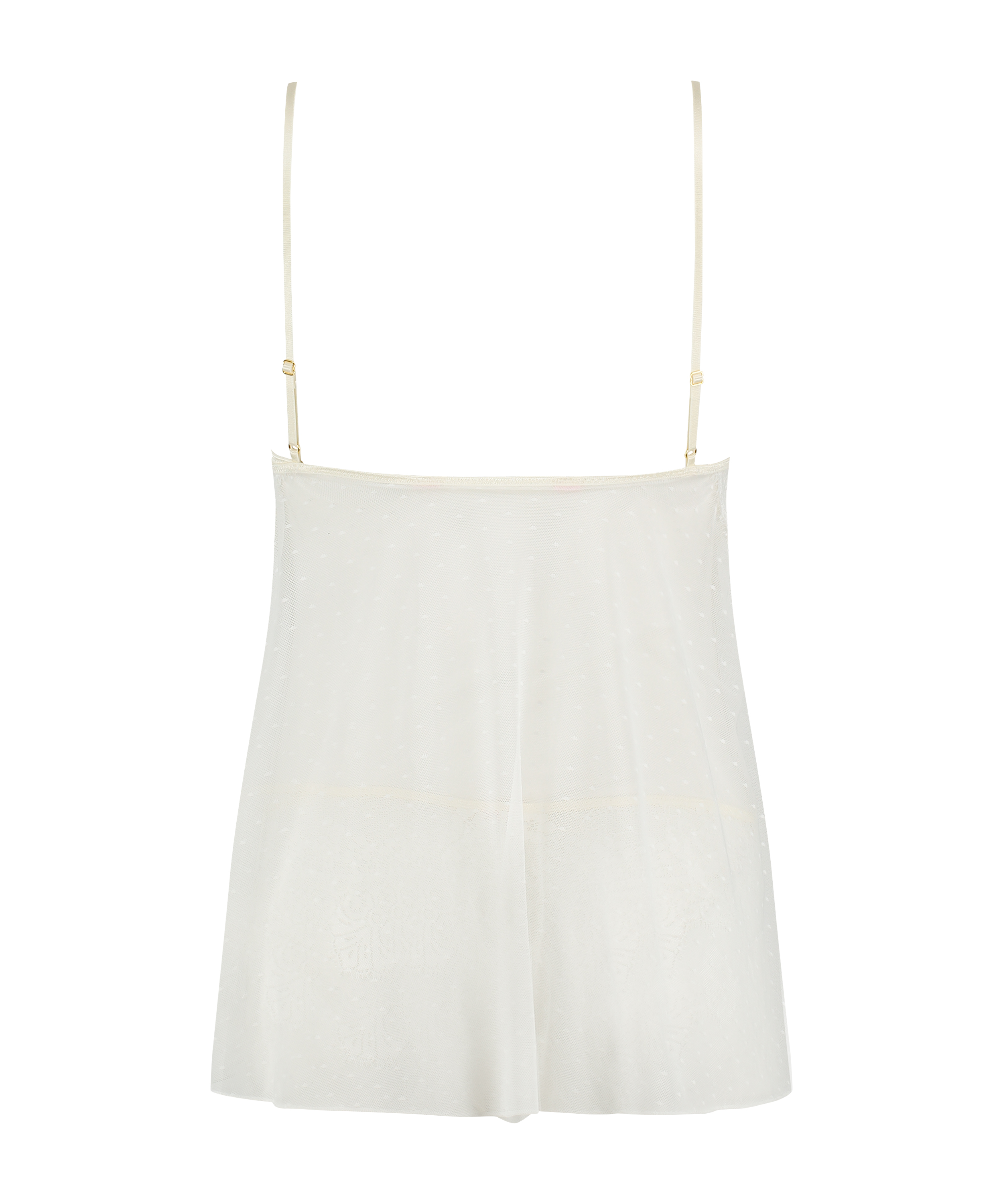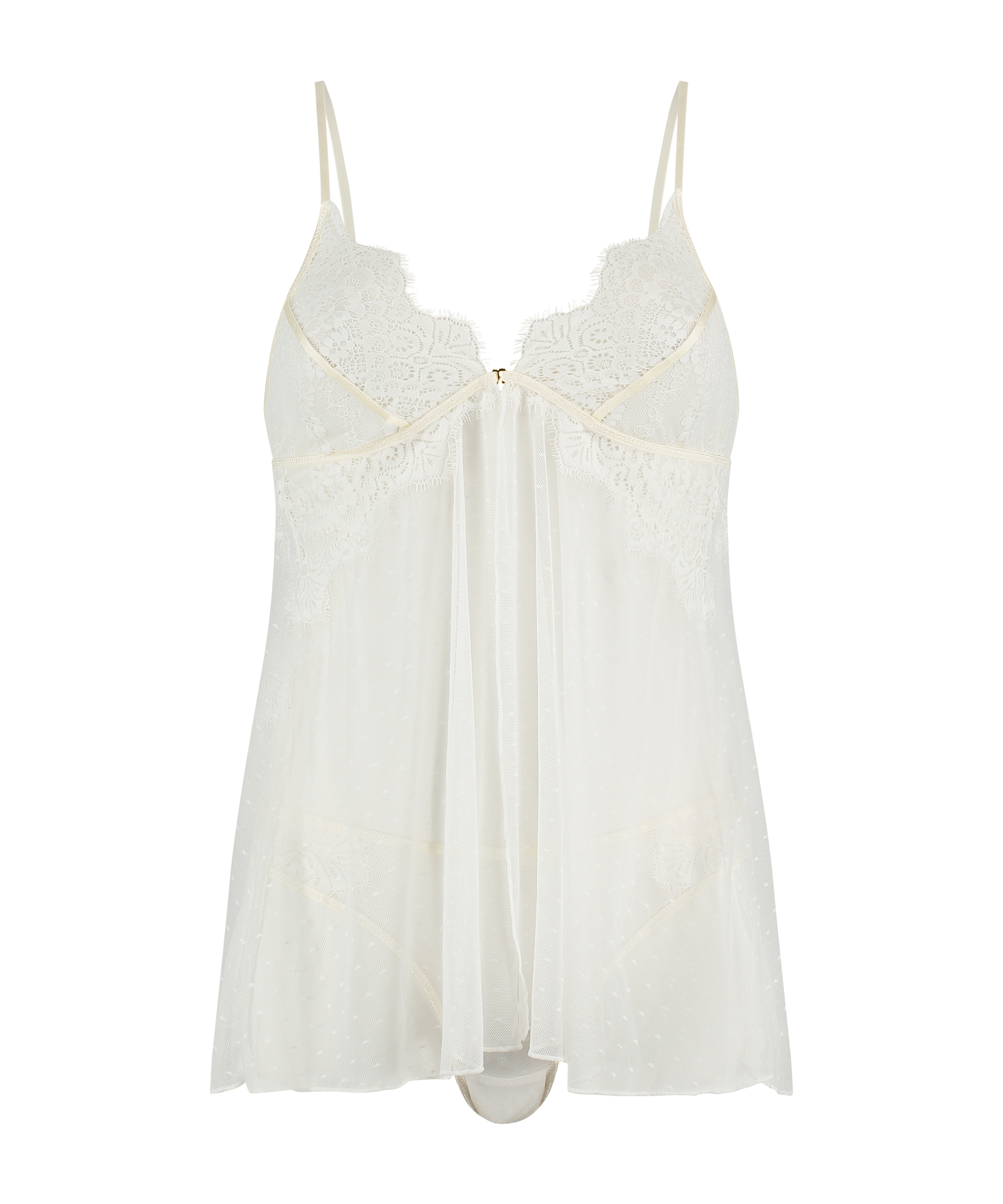 Denne babydollen er akkurat det du leter etter! Med blonder over det hele og semi-transparent look. Skålene er også dekket med blonder og stroppedetaljer. Den har lukking foran for enkel bruk. Det beste med den er at den kommer med matchende truser!