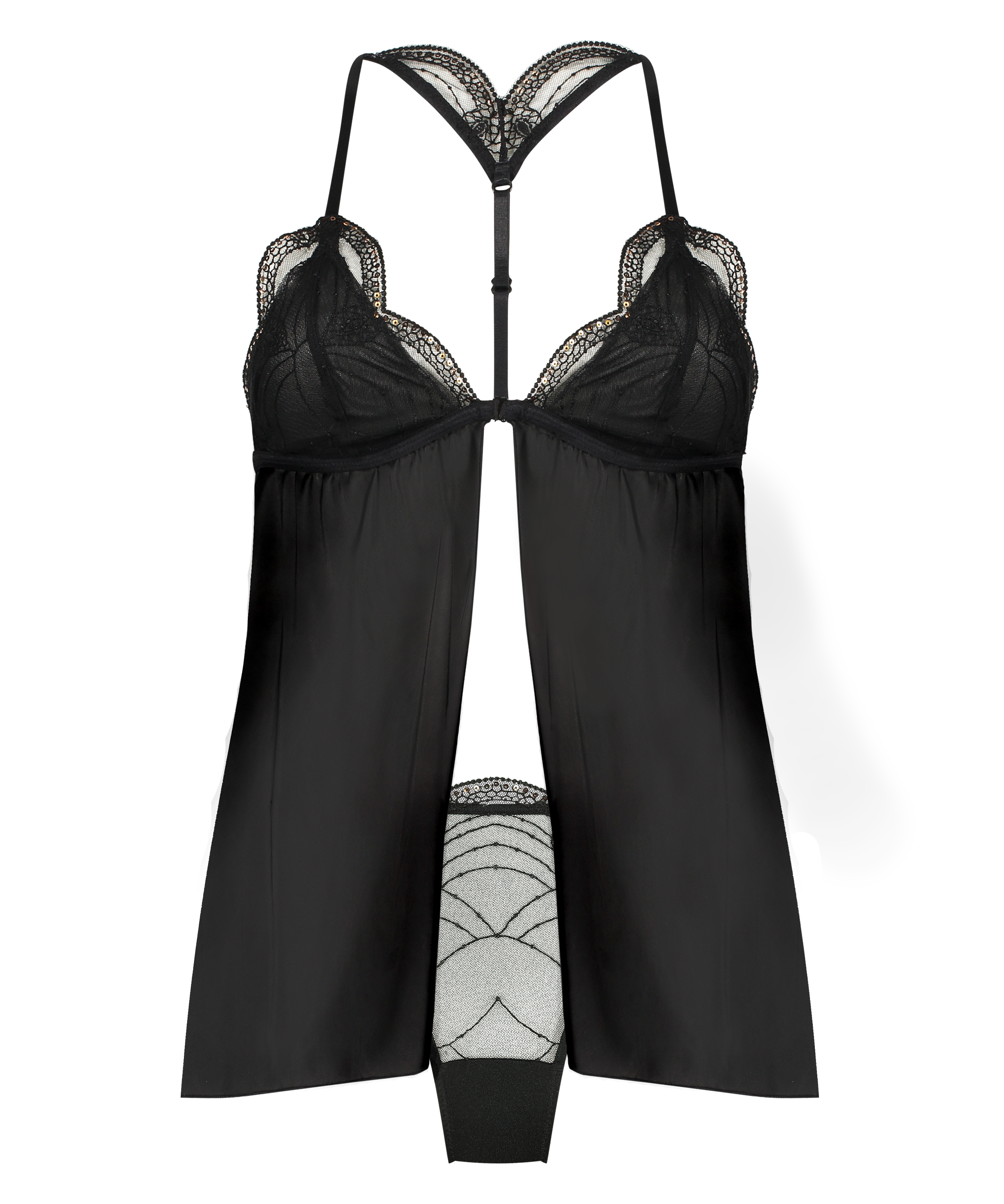 Leter du etter en sexy babydoll-kjole? Da er denne perfekt for deg. Forsiden er åpen og kjolen er laget av et satengaktig stoff. Båndene er regulerbare og blondene fortsetter over skuldrene.