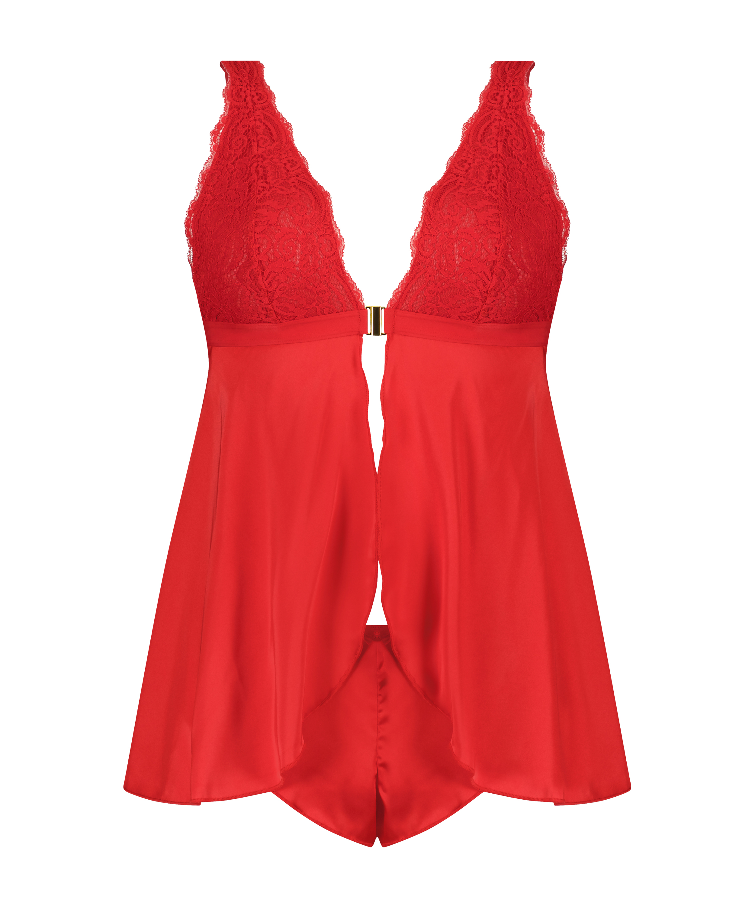 Leter du etter en sexy babydoll-kjole? Da er denne perfekt for deg. Forsiden er åpen og kjolen er laget av et satengaktig stoff. Båndene er regulerbare og blondene fortsetter over skuldrene. Kombiner med en matchende truse.