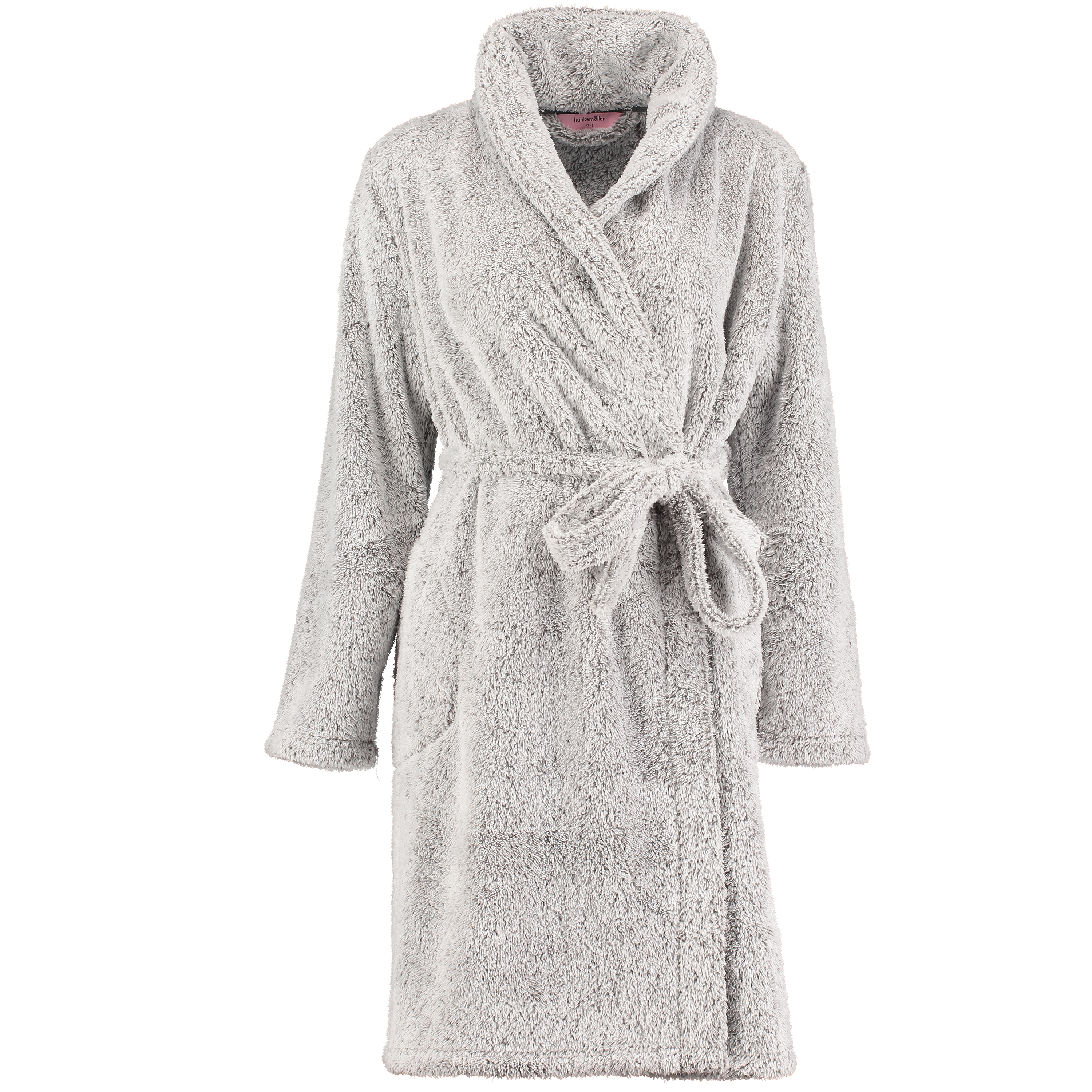 This lovely soft bathrobe is grey with a broad collar and a tie sash at the waist.