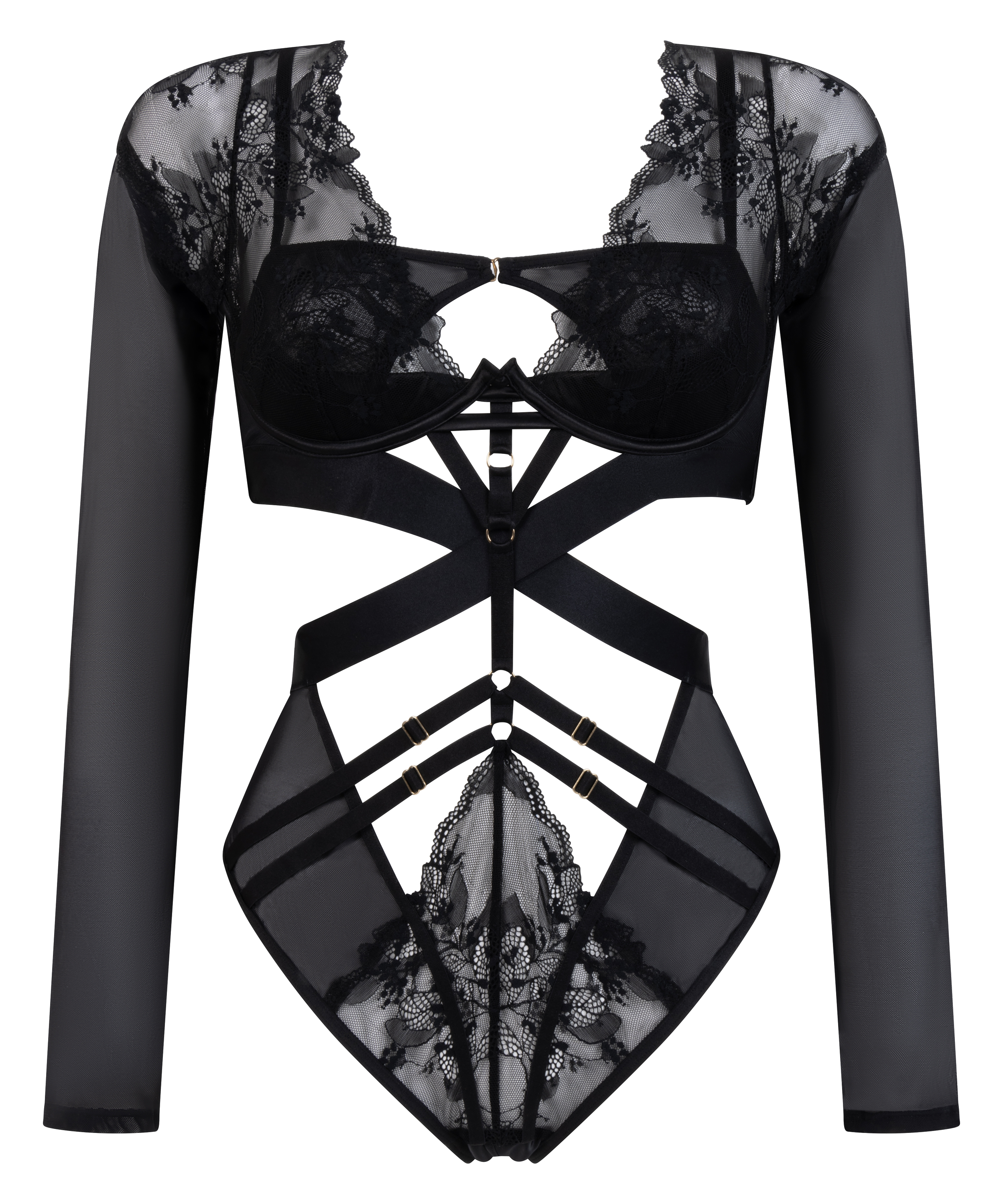 Denne langermete bodyen er designet med dristige utskjæringer som gir deg en dristig, men sofistikert look. Den er laget av luksuriøst mykt, elastisk stoff og former seg vakkert etter kroppen din, samtidig som den gir både komfort og selvtillit. Dette smykket er perfekt for å markere seg, og det redefinerer sensuell eleganse.