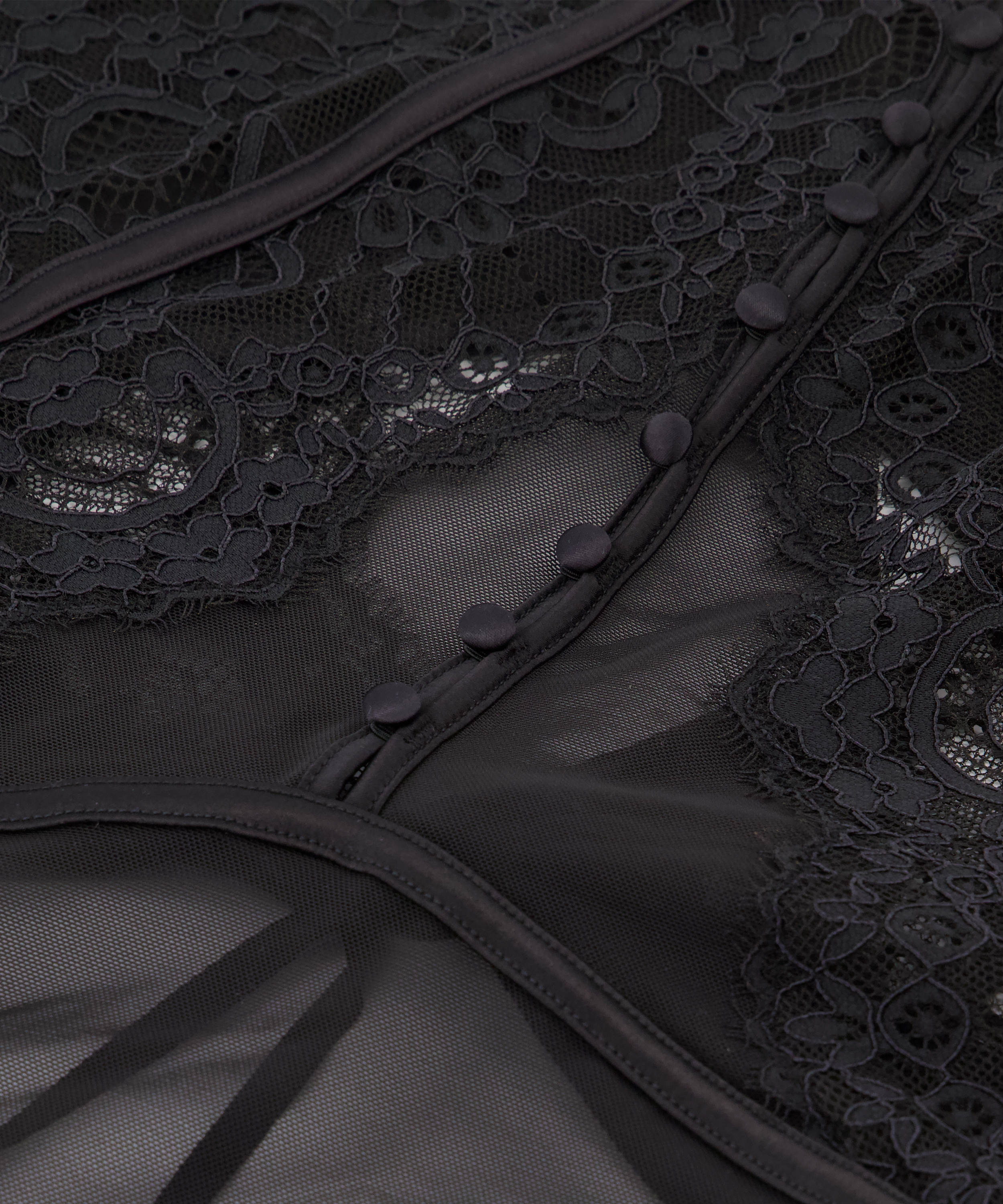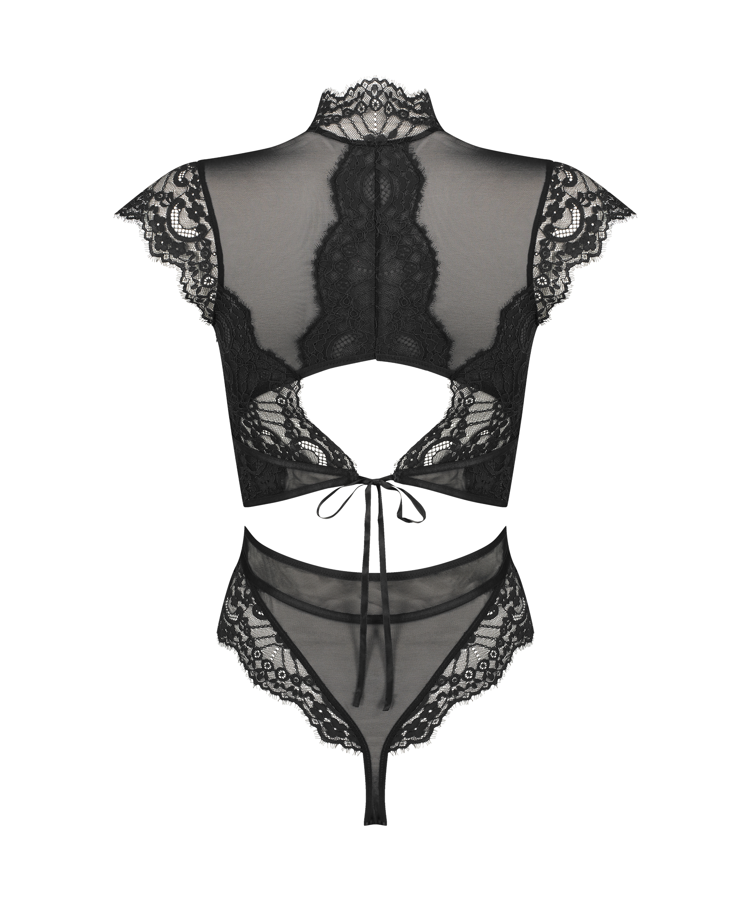 Føl deg sexy i denne fantastiske, praktfulle bodyen med korte ermer og åpen rygg. Denne bodyen har vakre knytinger som detaljer foran og er nesten dekket av blonder.