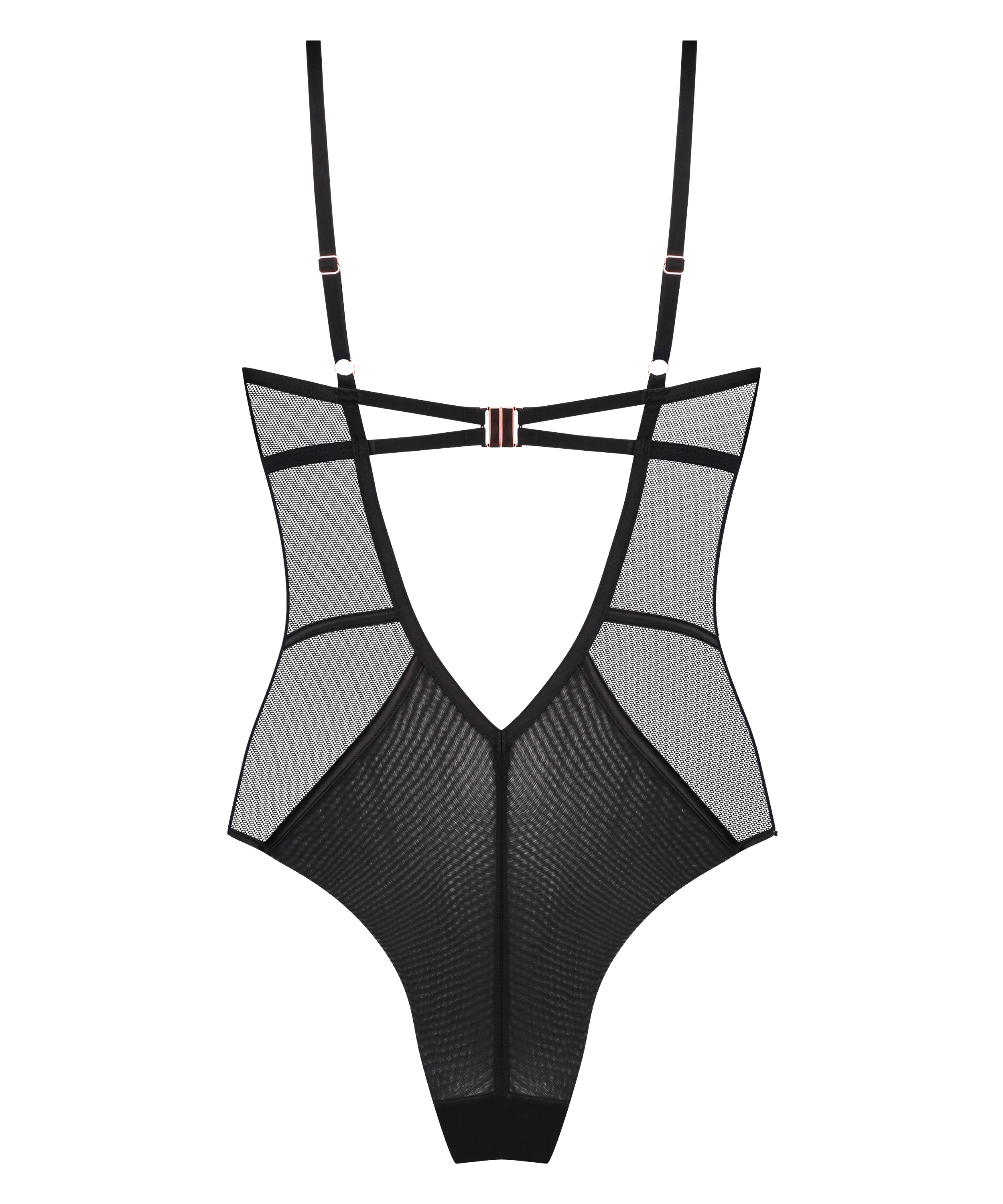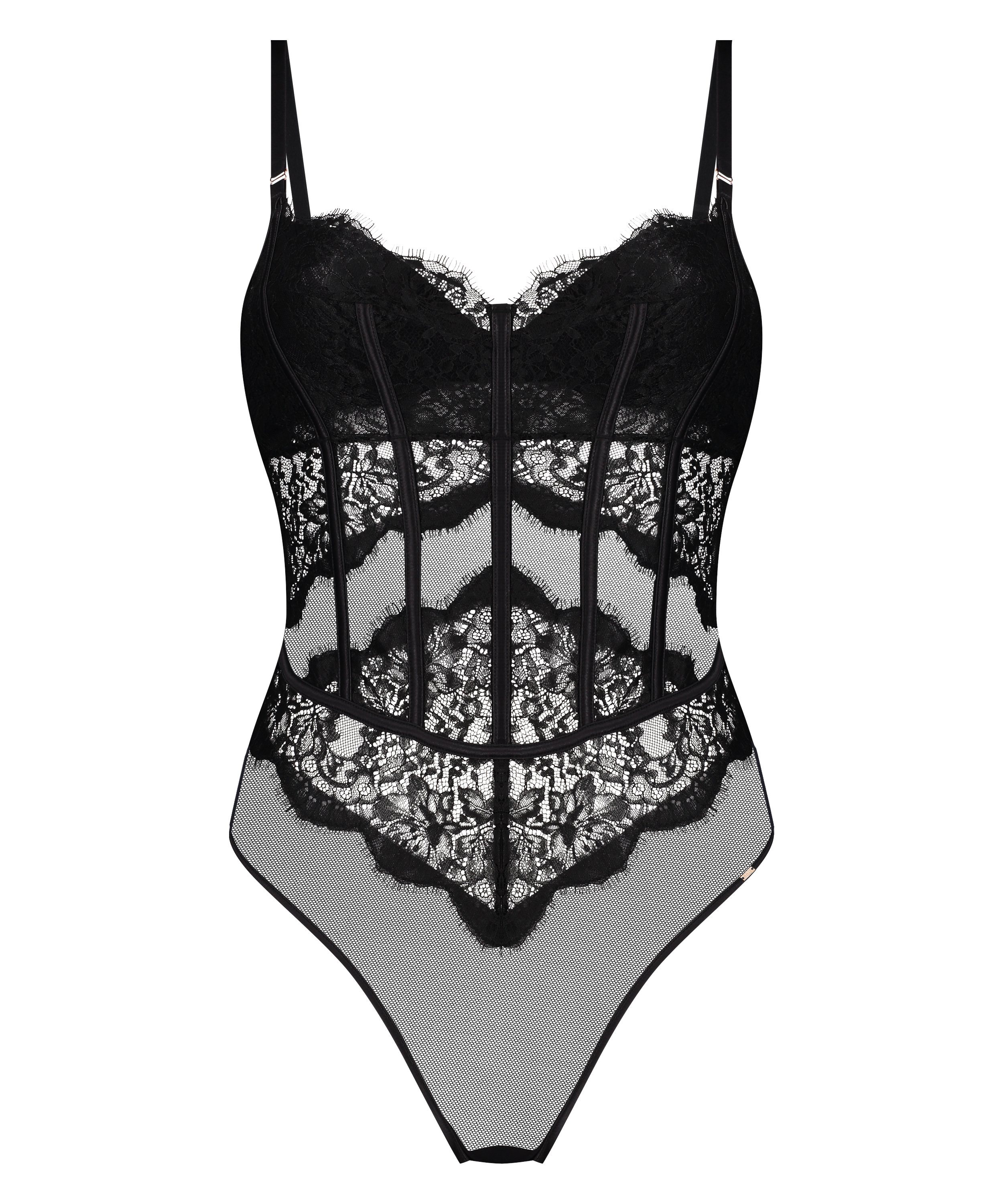 Denne bodysuiten kombinerer delikat blonder og mesh for et elegant, men fristende utseende. Den strukturerte bøylen og forsterkningen gir støtte og former en flatterende silhuett. Justerbare stropper gir en tilpasset passform, mens de gjennomsiktige panelene tilfører et sofistikert preg. Designet for både stil og komfort, dette er et raffinert og dristig undertøysplagg.