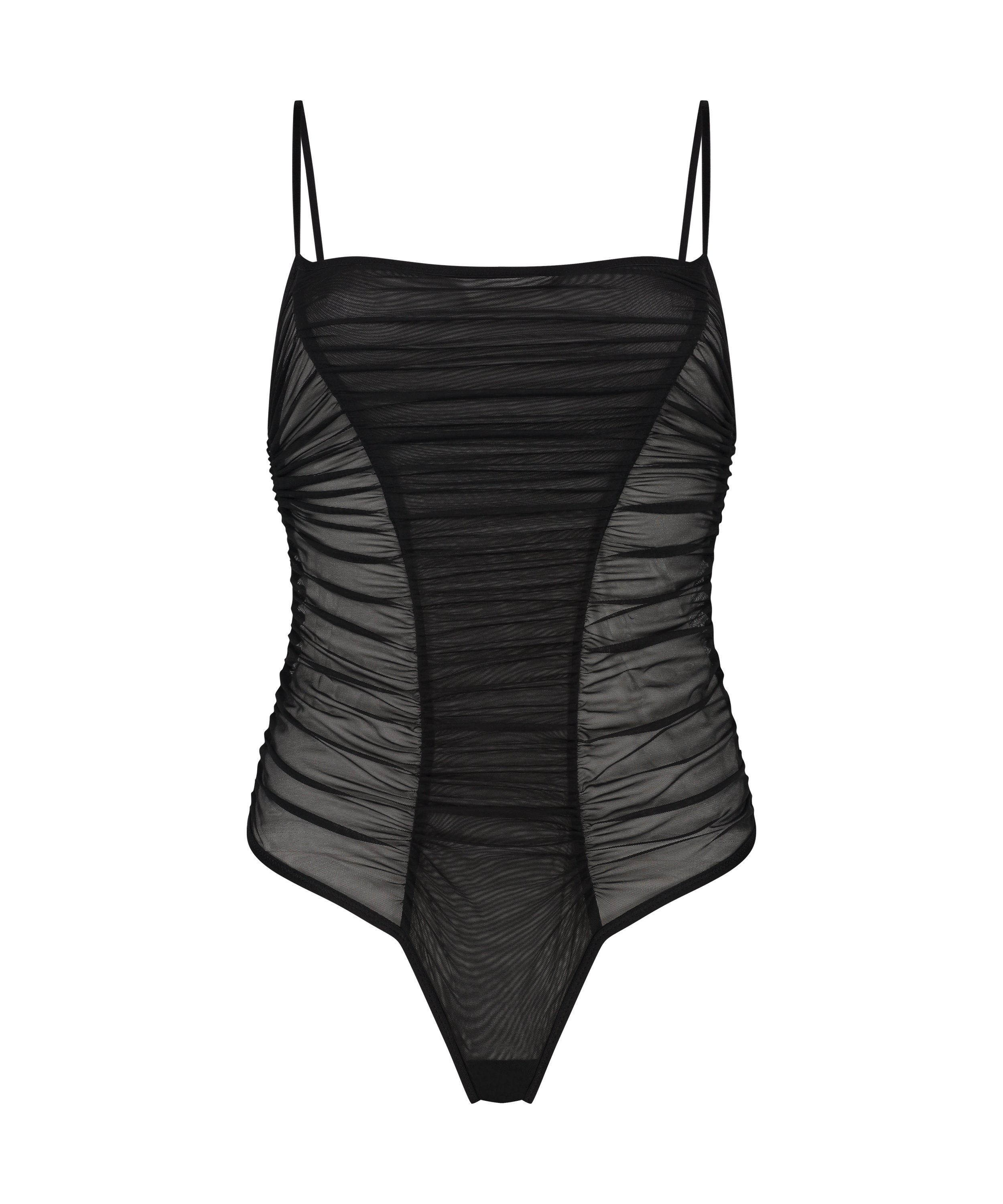 Denne mesh-bodysuiten er et must-have for alle fashionistaer. Med et flatterende rynket design er denne bodysuiten både stilig og komfortabel. Mesh-stoffet er mykt og pustende, noe som gjør den perfekt til bruk hele dagen.