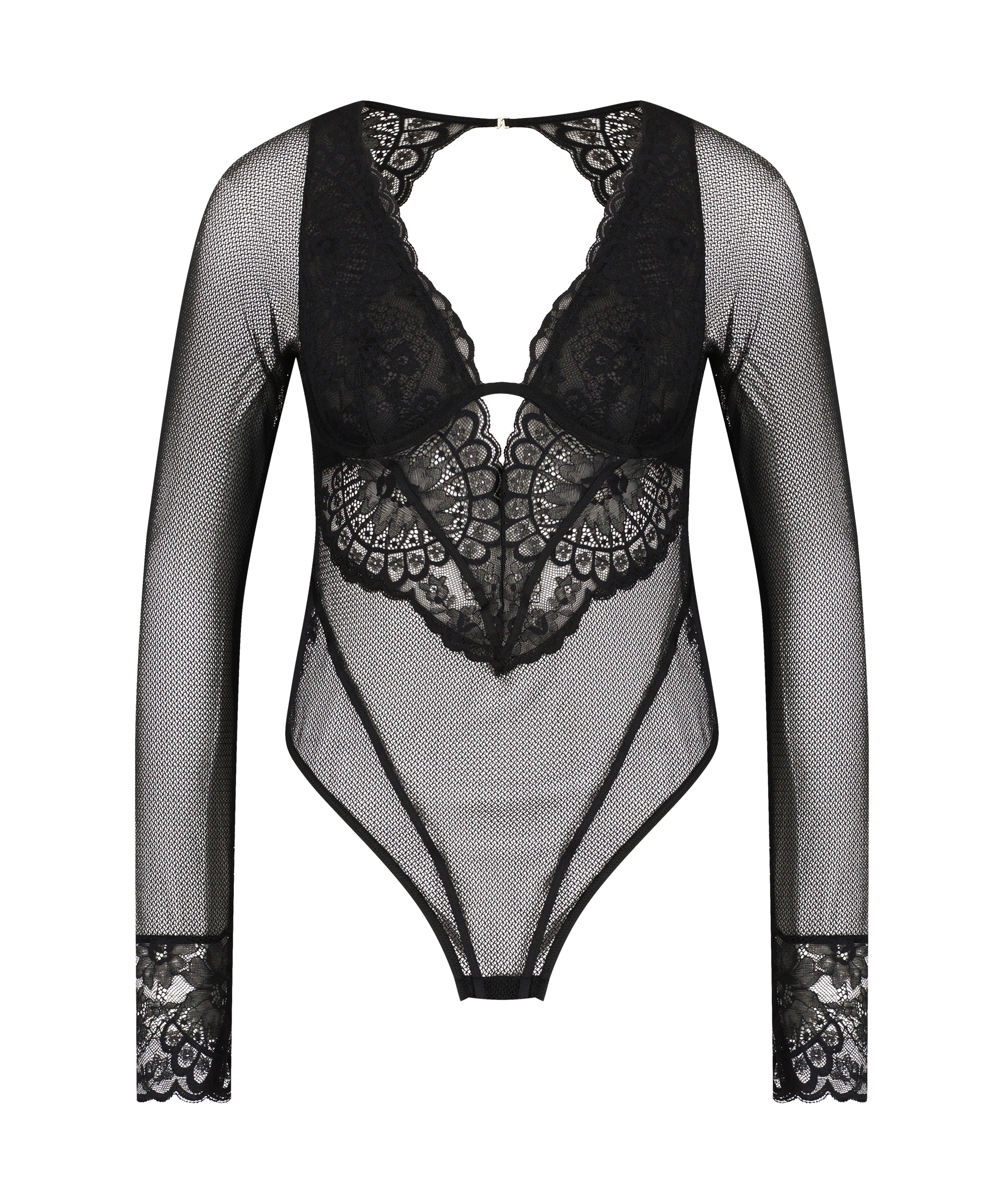 Denne bodyen har myke forførende blonder med lange ermer og bøyler som gir støtte. Denne bodysuiten har en perfekt passform som gir deg en elegant og oppsiktsvekkende silhuett med en utskåret rygg og den lukkes med trykknapp nederst.