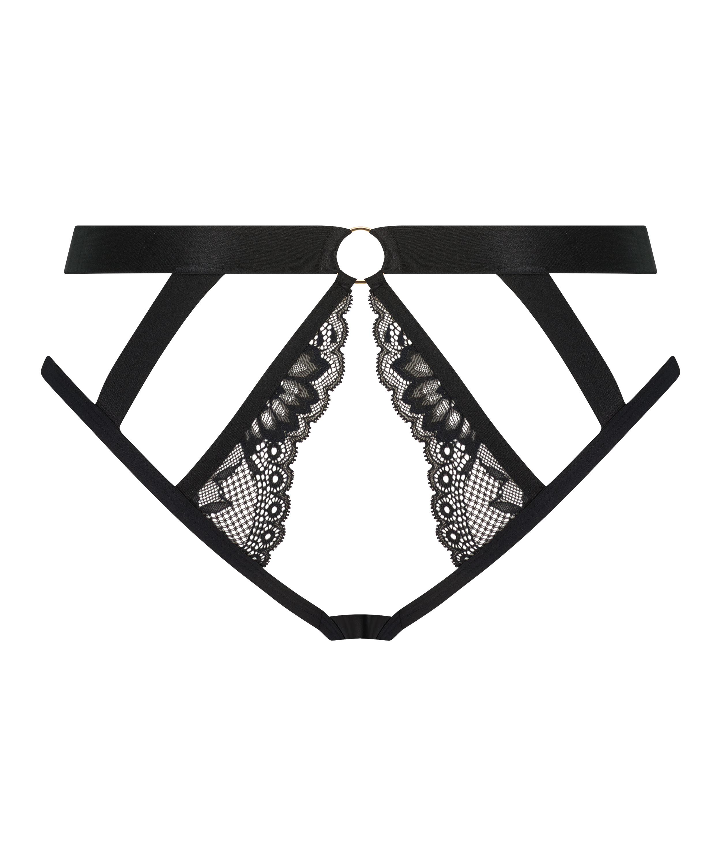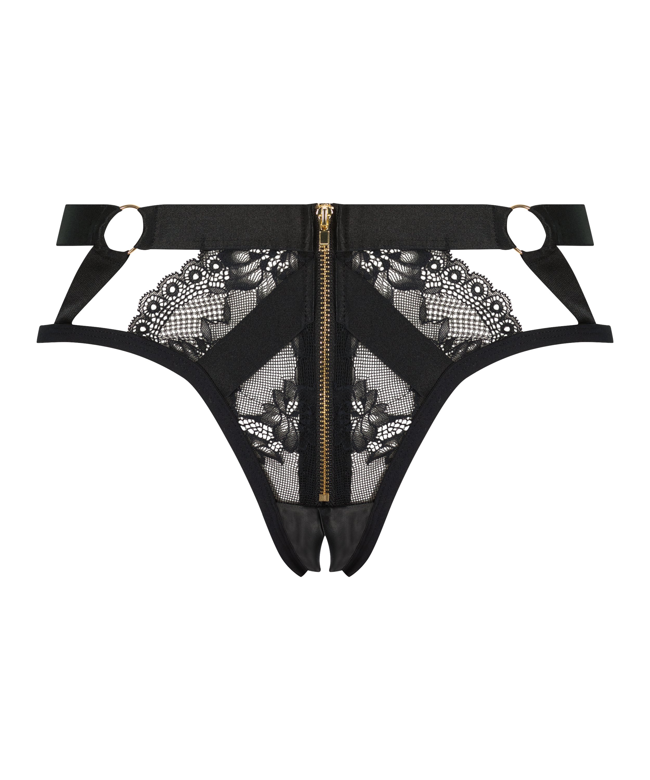 Disse brasilianske trusene med åpent skritt er alt du trenger og mer til. De har en kombinasjon av blonder og netting med mange stroppedetaljer. Den sexy frontale glidelåsåpningen gjør den ekstra sexy. Gjør settet komplett med matchende BH og strømpeholdere!