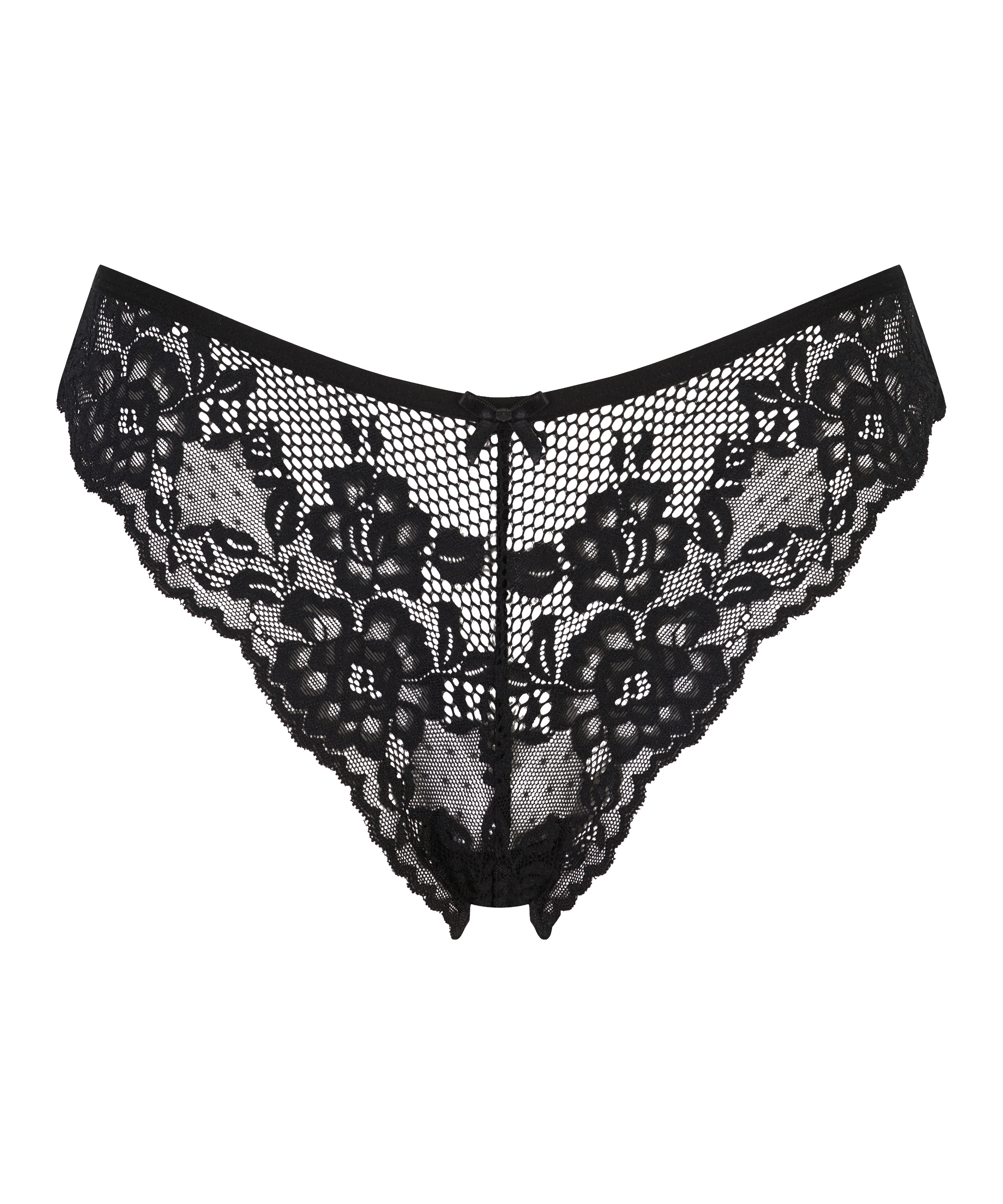 Denne halvt gjennomsiktige trusen har en mengde blonder. Den lille sløyfen foran er en pen avsluttende detalj.