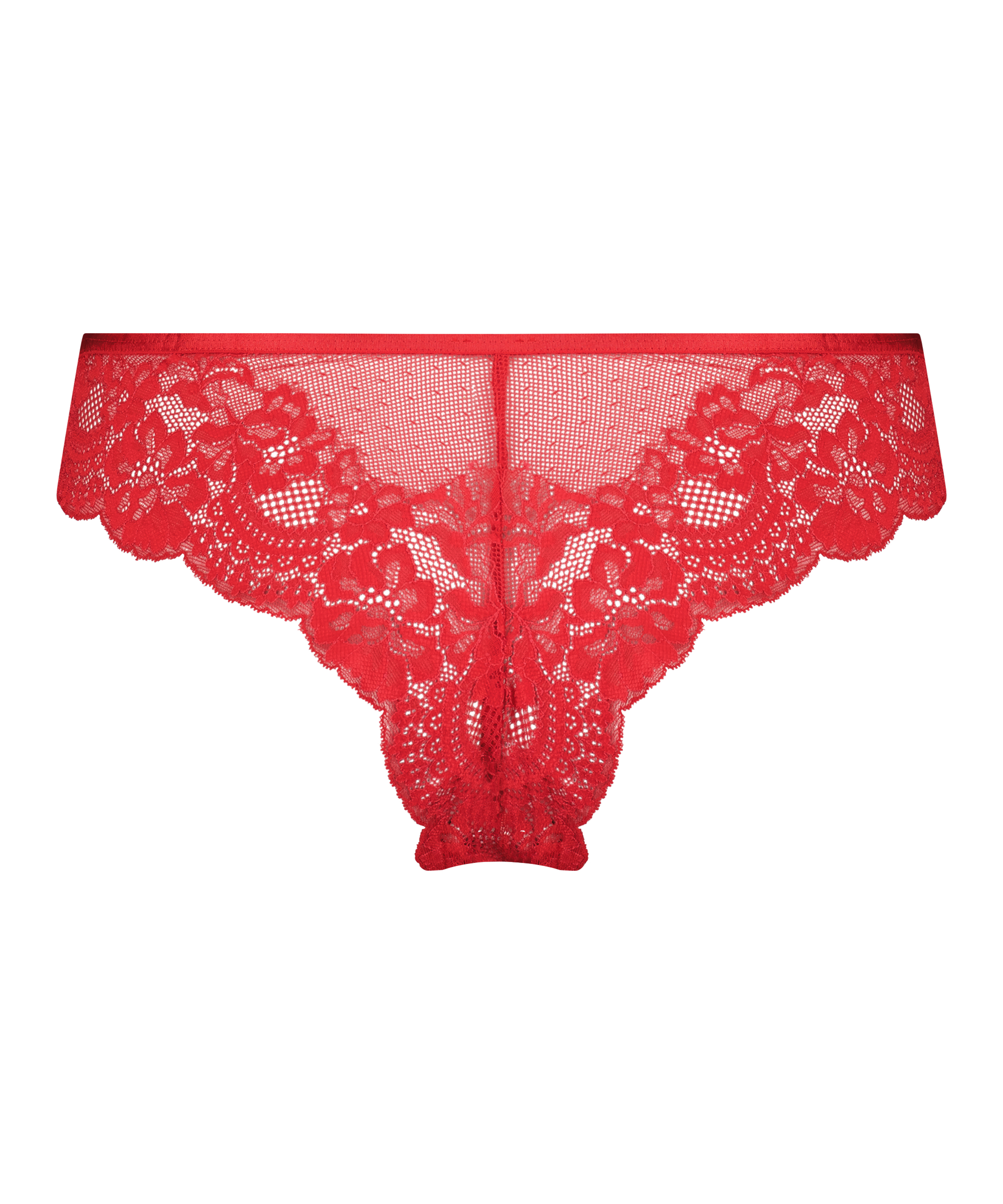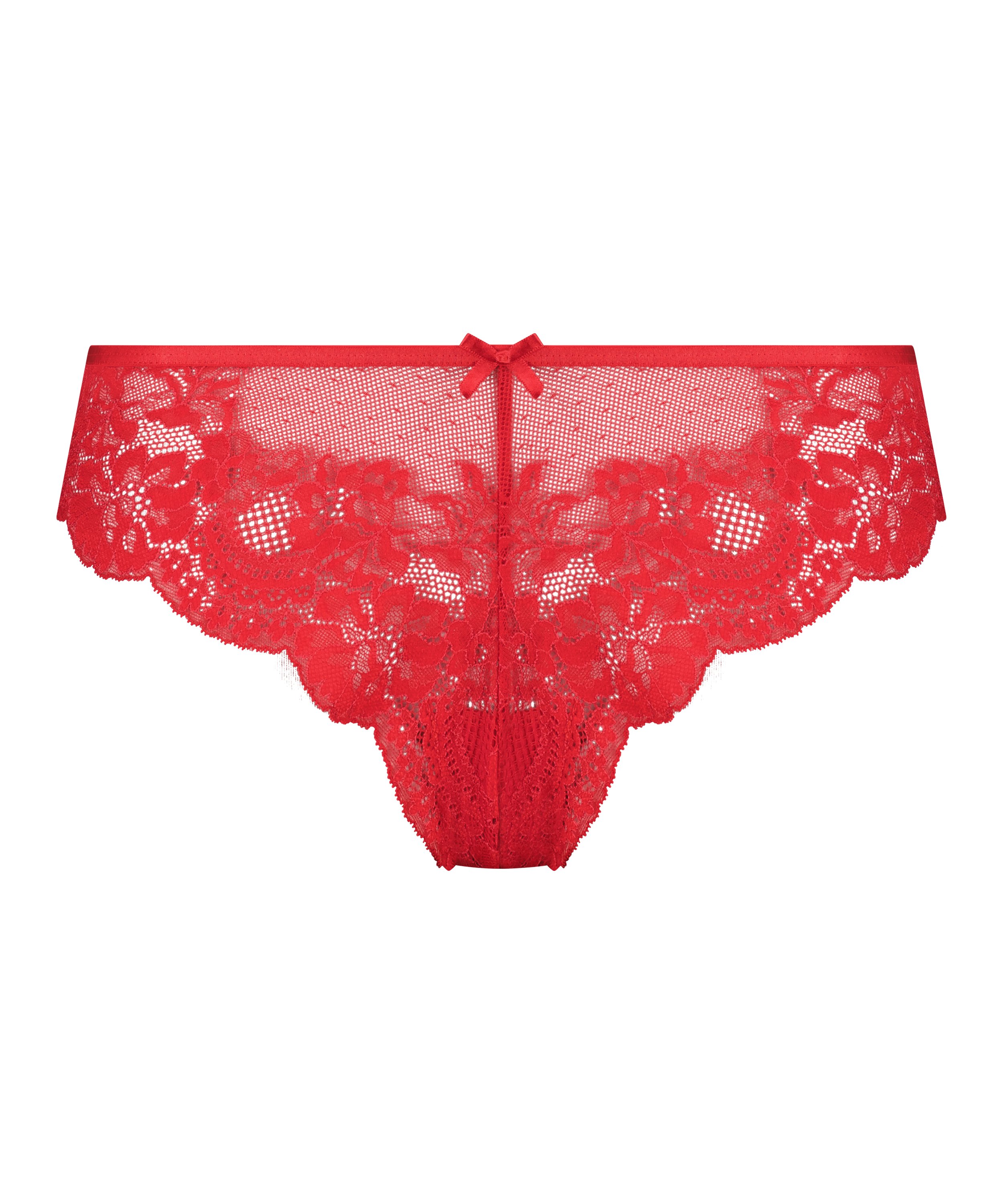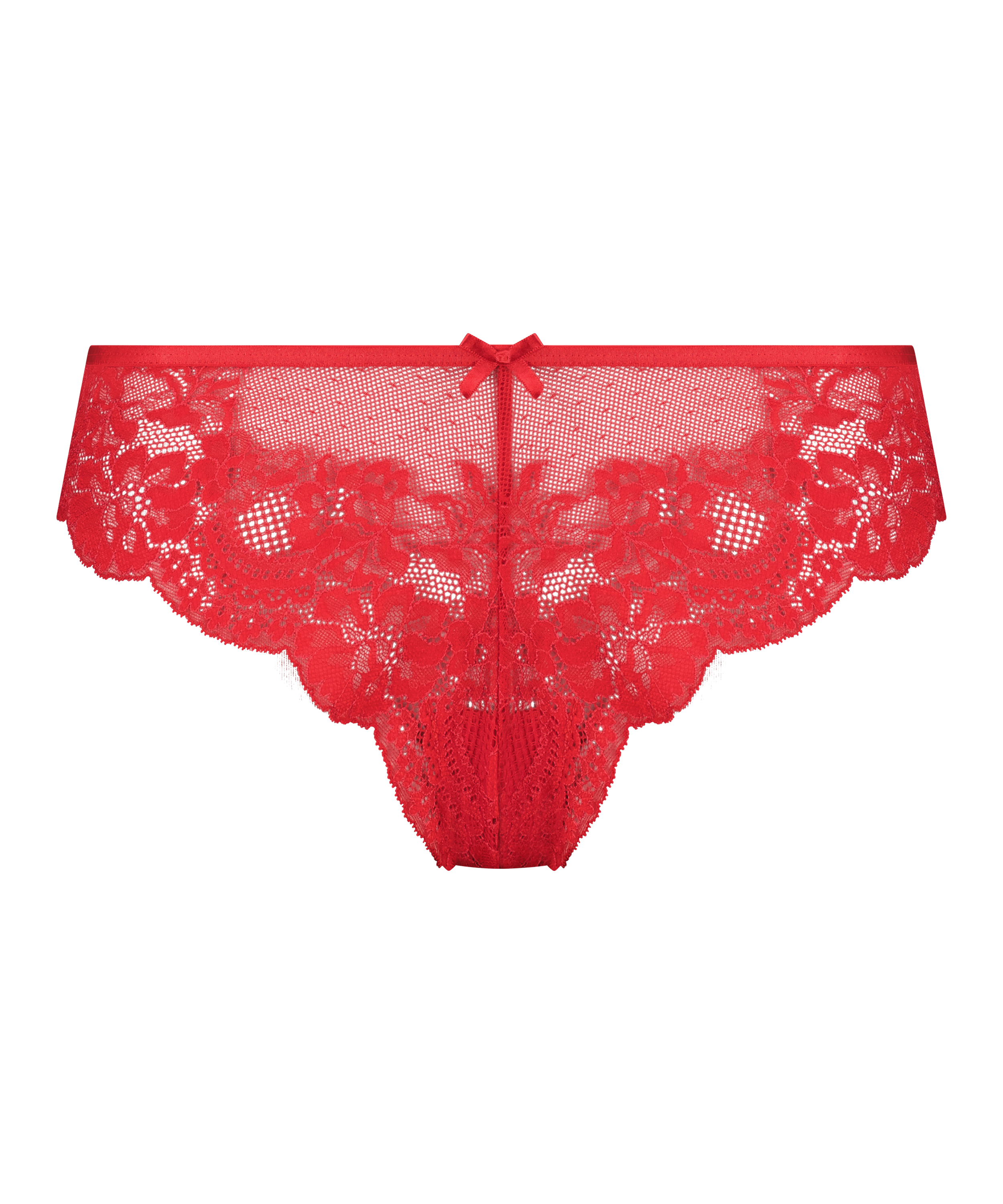 Skap en sexy look med denne brasilianske trusen. Den er laget av halvt gjennomsiktige blonder, og den lille sløyfen foran utgjør en søt finishing touch. Kombiner med din egen favoritt-BH!