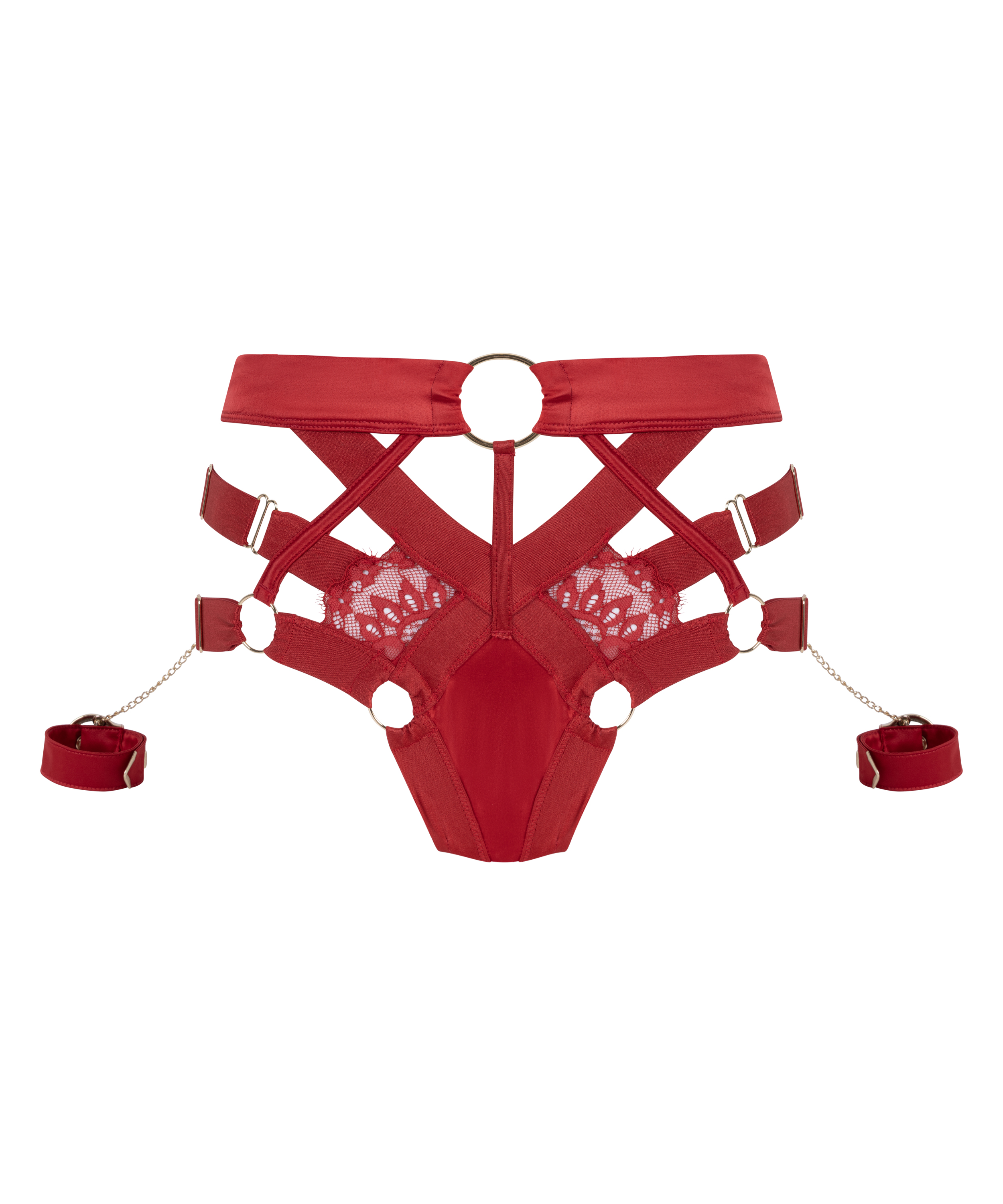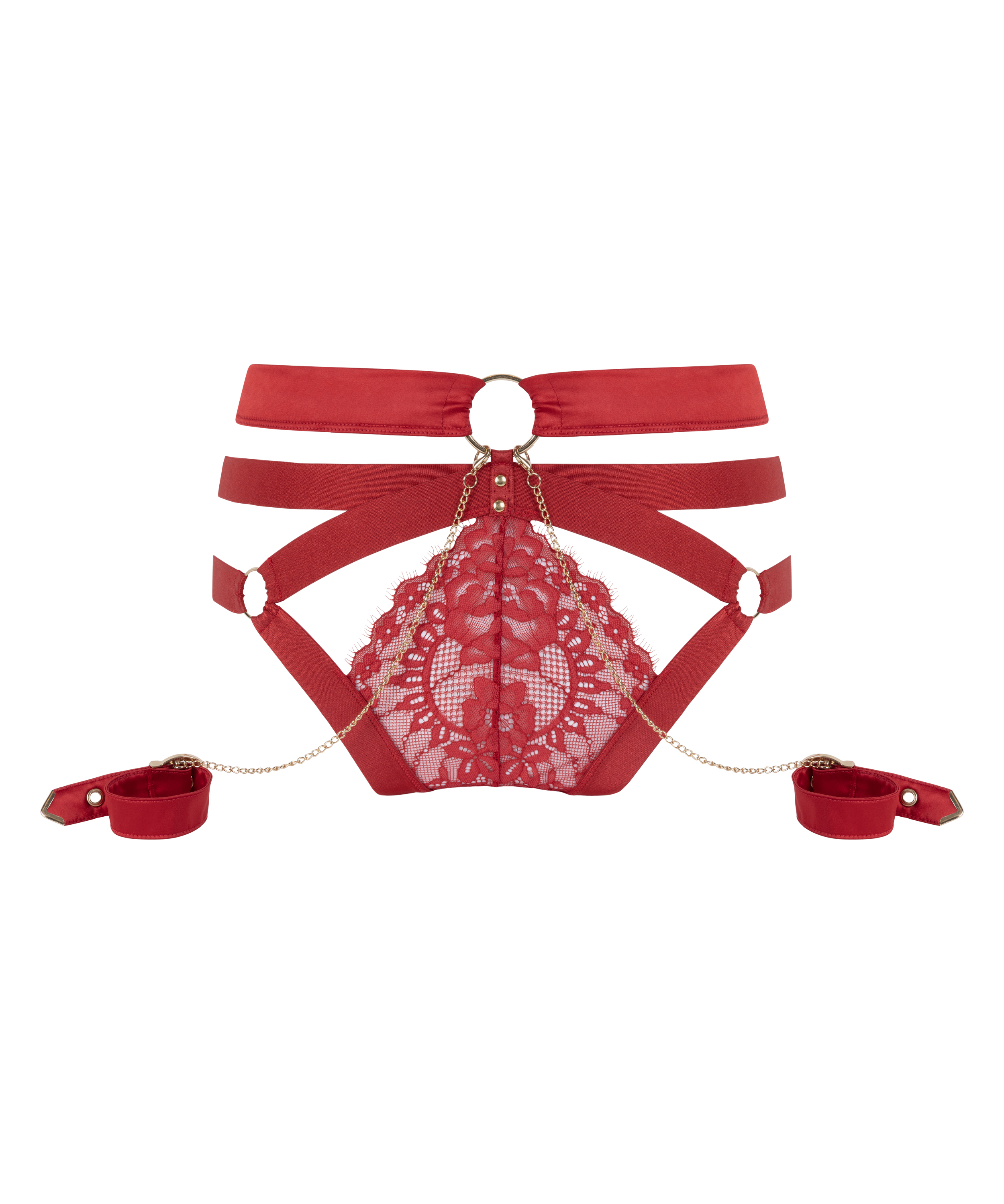 Løft selvtilliten med denne elegante blondeslipen med stropper, designet for dristighet og forførelse. Med intrikate blondedetaljer, sensuelle utskjæringer og justerbare stropper er denne slipen laget for å trekke oppmerksomhet. De avtakbare håndleddsbåndene gir lekenhet og gir mulighet for variasjon, slik at du kan tilpasse utseendet til spesielle anledninger.