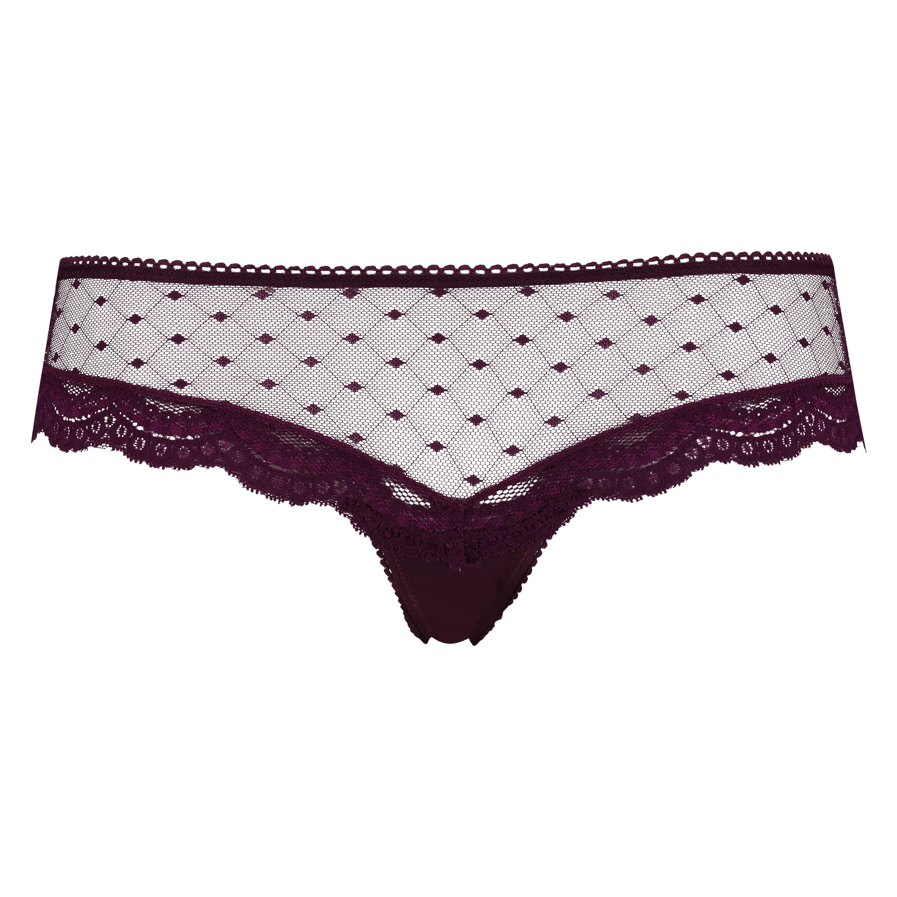 These eye-catching Brazilian knickers are sure to cheer you up. They are made from semi-transparent fabric with subtle dotted pattern on the front. The back is finished with a zigzag tie-string closure.