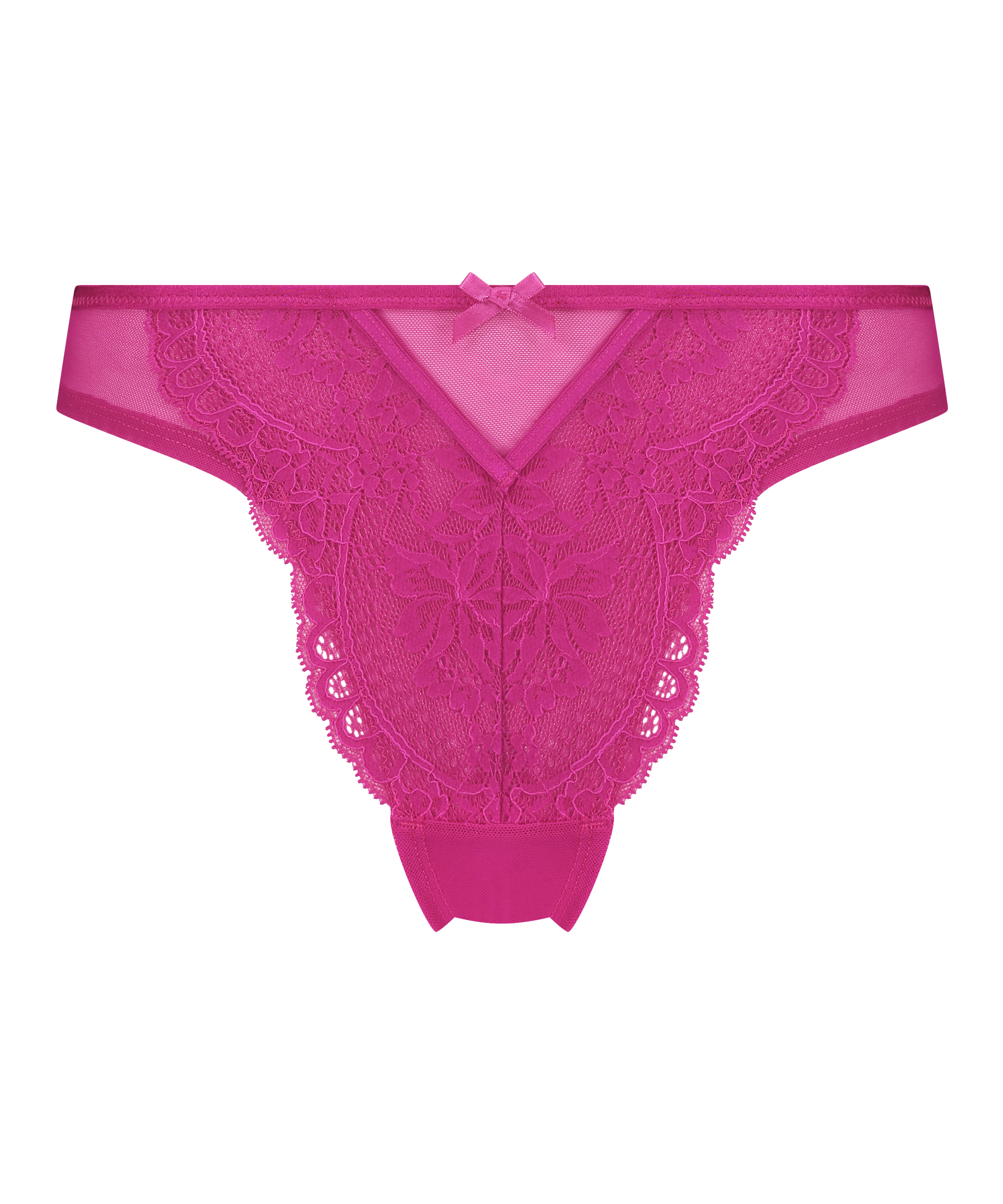 Gå ikke glipp av denne vakre brasilianske trusen! Blondene bak lager en sexy halvt gjennomsiktig look. Denne brasilianske trusen har høy benskjæring, og foran har den en vakker liten sløyfe. Kombiner med den matchende behå-en for en gjennomført look.