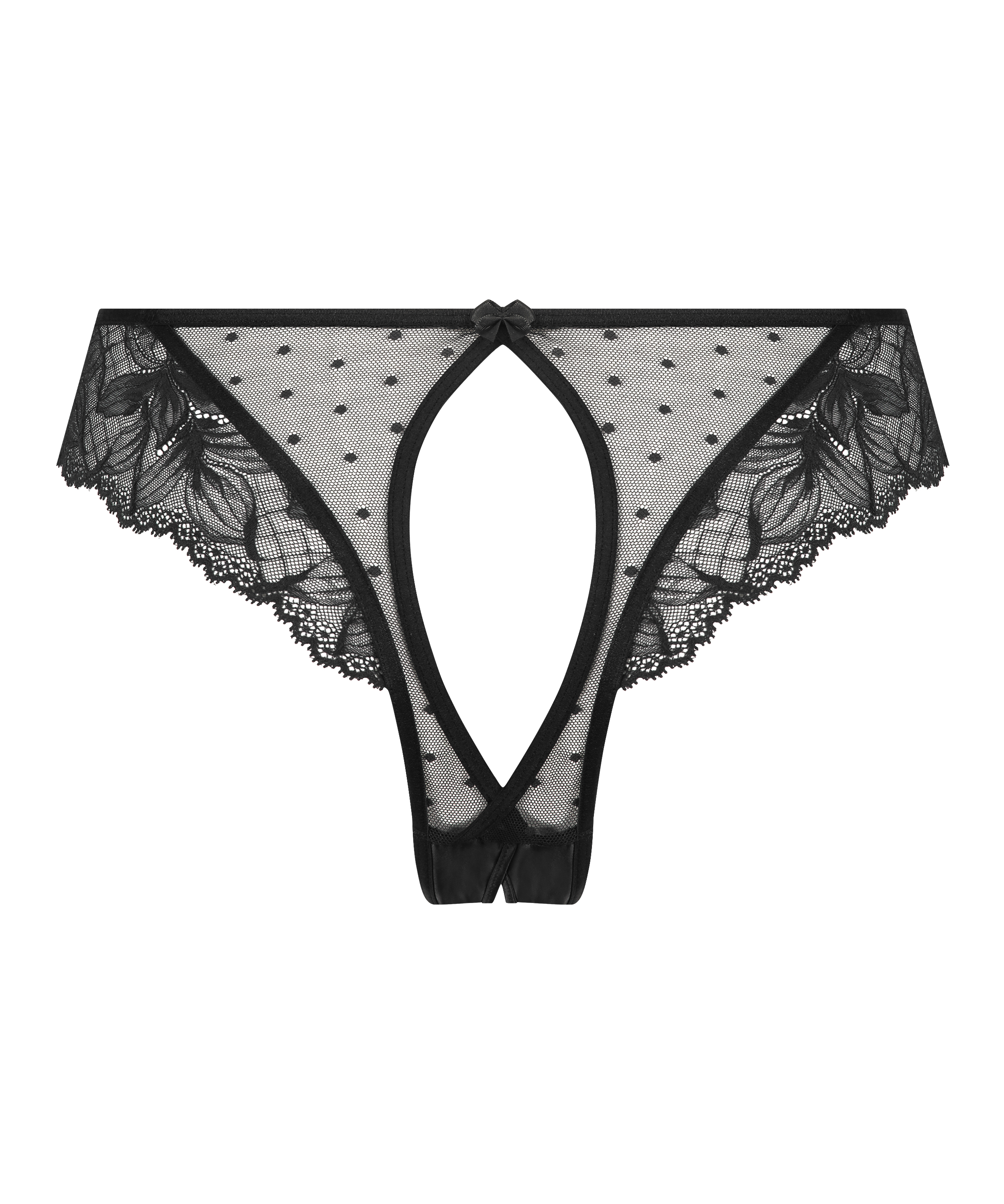 Piff opp stemningen med denne unike brazilian-trusen med åpning i skrittet. Med nettinglook over det hele og med blondedetaljer på hoftene. Det er et nydelig blondeskjørt på hoftene og åpningen i skrittet gjør den ekstra spennende. Den har sexy utskårne detaljer og en søt sløyfe på brystet og bak. Gjør dette settet komplett med en matchende BH! En del av vår Private-kolleksjon.