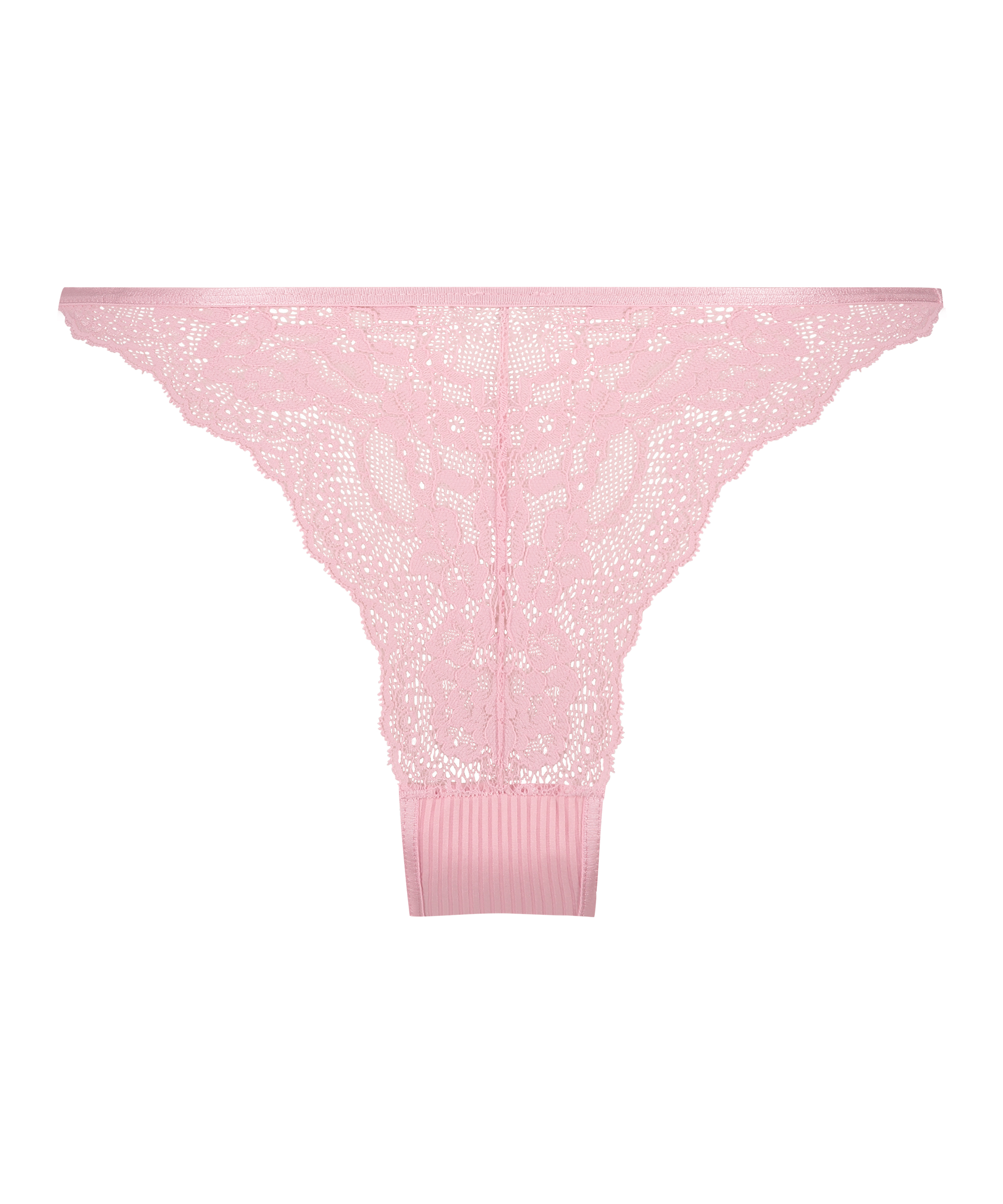 Hvis du er på jakt etter behagelige og lette truser, er disse perfekte for deg. Baksiden har masse veldig romantiske og elegante blonder, mens fronten har et halvt gjennomskinnelig ribbestrikket look. Kombiner med favoritt-BH-en din!