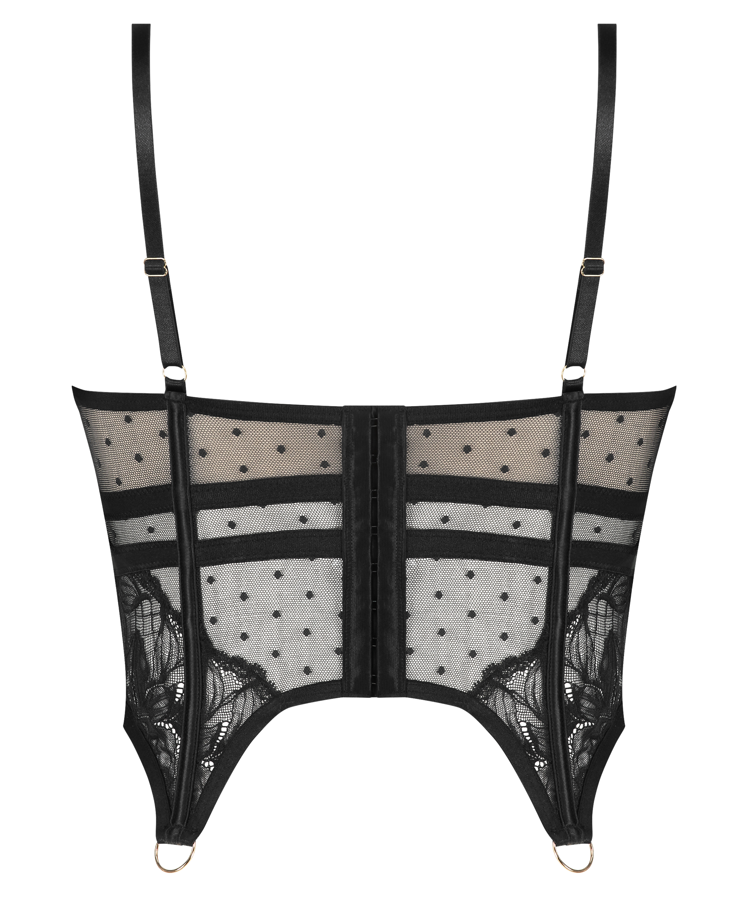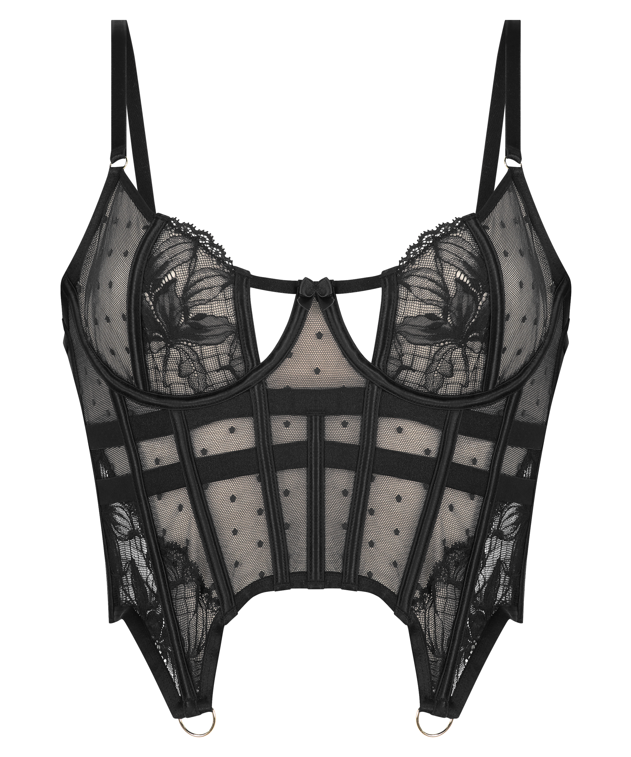 Føl deg sexy i denne vakre bustieren!Med behagelige upolstrede kopper med utskårne detaljer og stropper. På grunn av spiler foran, i sidene og bak er den superstøttende, og vil få deg til å se fantastisk ut. Med semi-transparent look og blonder og netting, og med mulighet for feste til strømpestropper. Gjør settet komplett med matchende truse! En del av vår Private-kolleksjon.