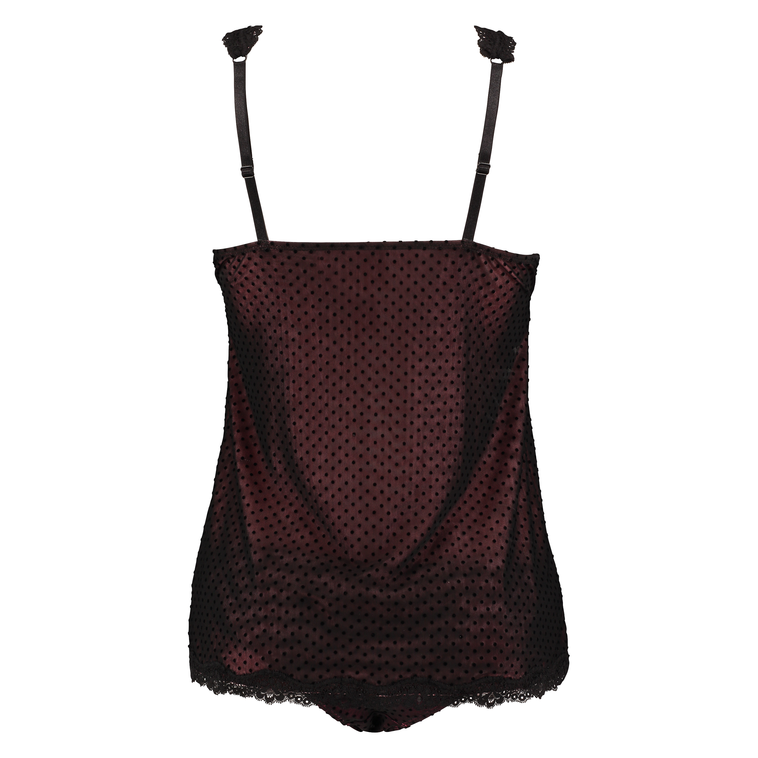 This sexy cami set is made from semi-transparent fabric with a subtle dotted pattern and consists of a top and bottoms. This cami set is finished with a lace edge.