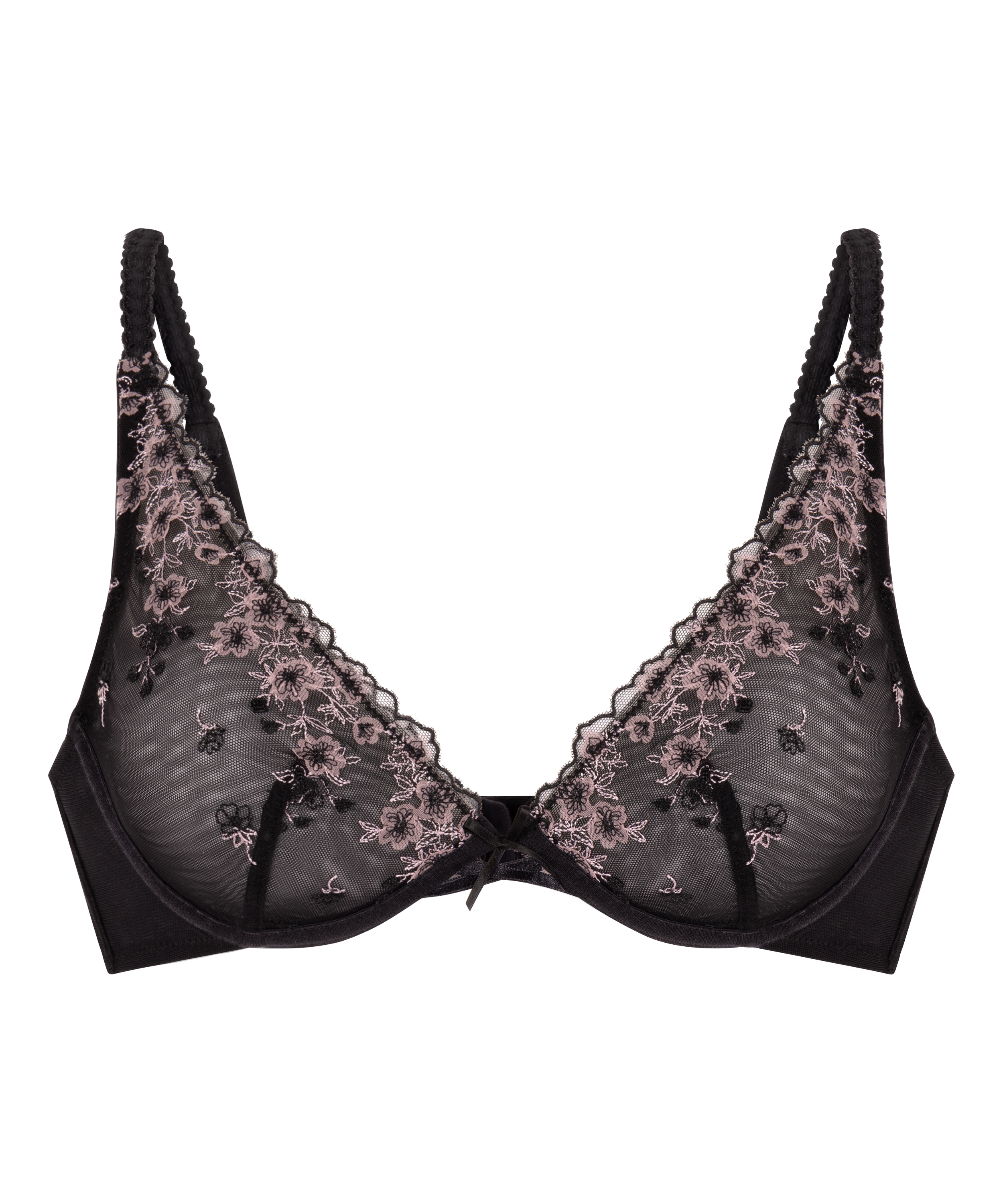 Delikat, dristig og med vakre detaljer – vår upolstrede plunge-BH er designet for å fremheve dine naturlige former med et snev av romantikk. De halvtransparente skålene er prydet med myke blondeblomster, noe som gir en lett, feminin look som føles like bra som den ser ut. Det er den perfekte blandingen av eleganse og hverdagskomfort.