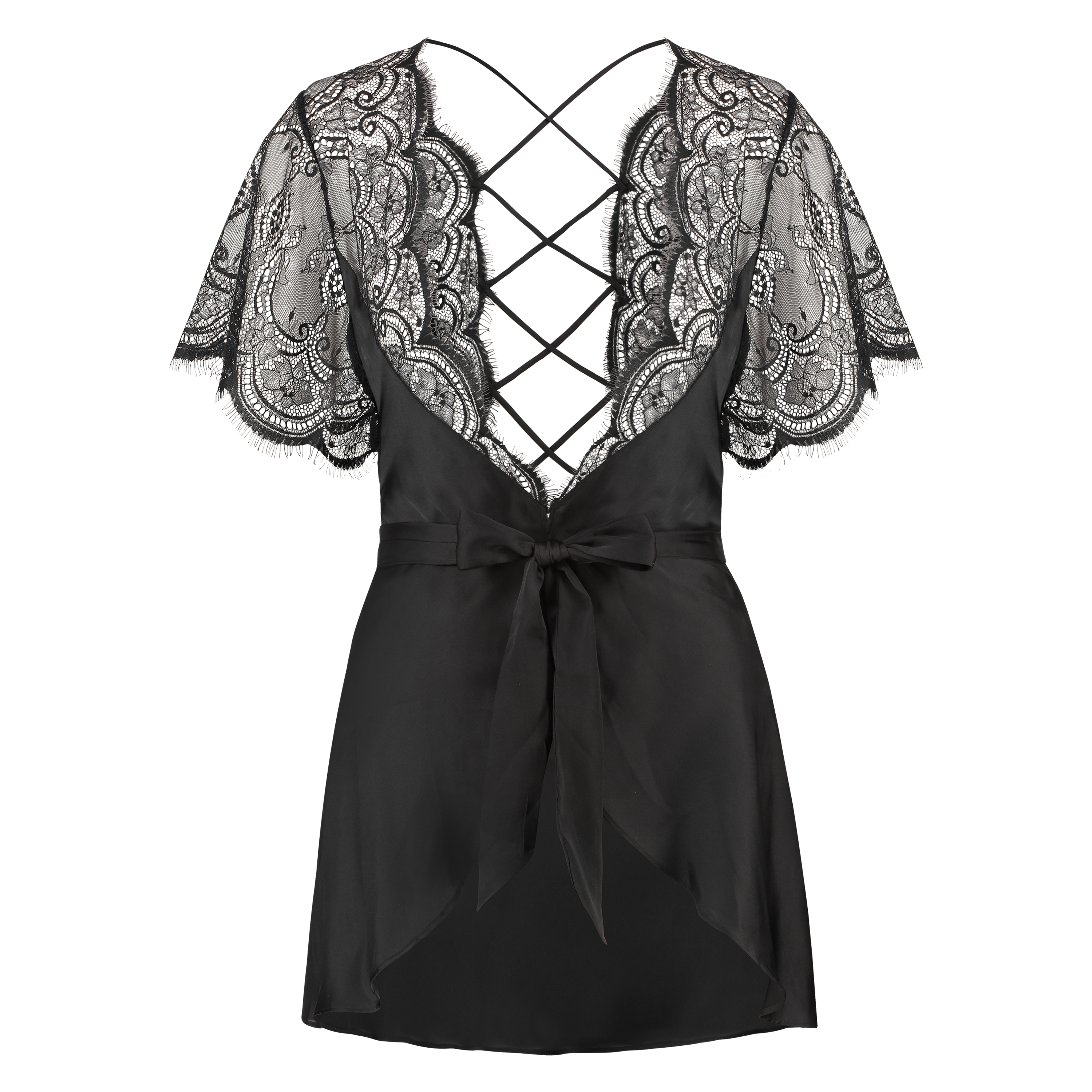 Sexy kimono med semi-transparent blonder og mesh. Denne kimonoen har korte ermer og en elegant lukket rygg. En del av den private samlingen.