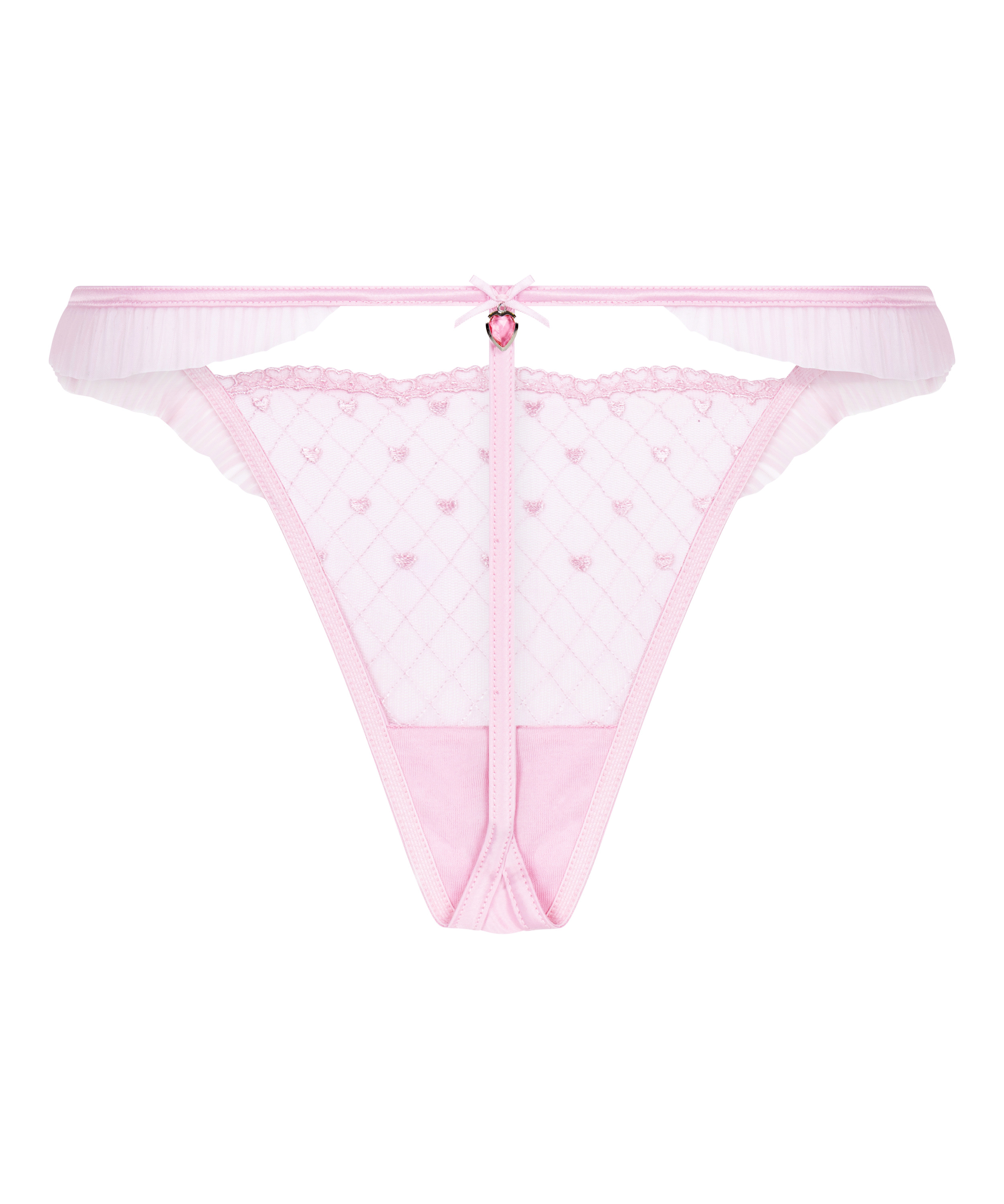 Fullfør looken med denne mesh-strengen designet med et snev av glans for ekstra glamour. Det transparente stoffet og det minimalistiske snittet skaper en sexy, men likevel elegant silhuett. Den er lett og pustende, og passer perfekt sammen med den matchende trekant-braletten for et koordinert sett. Et must for alle som elsker glitrende undertøy!