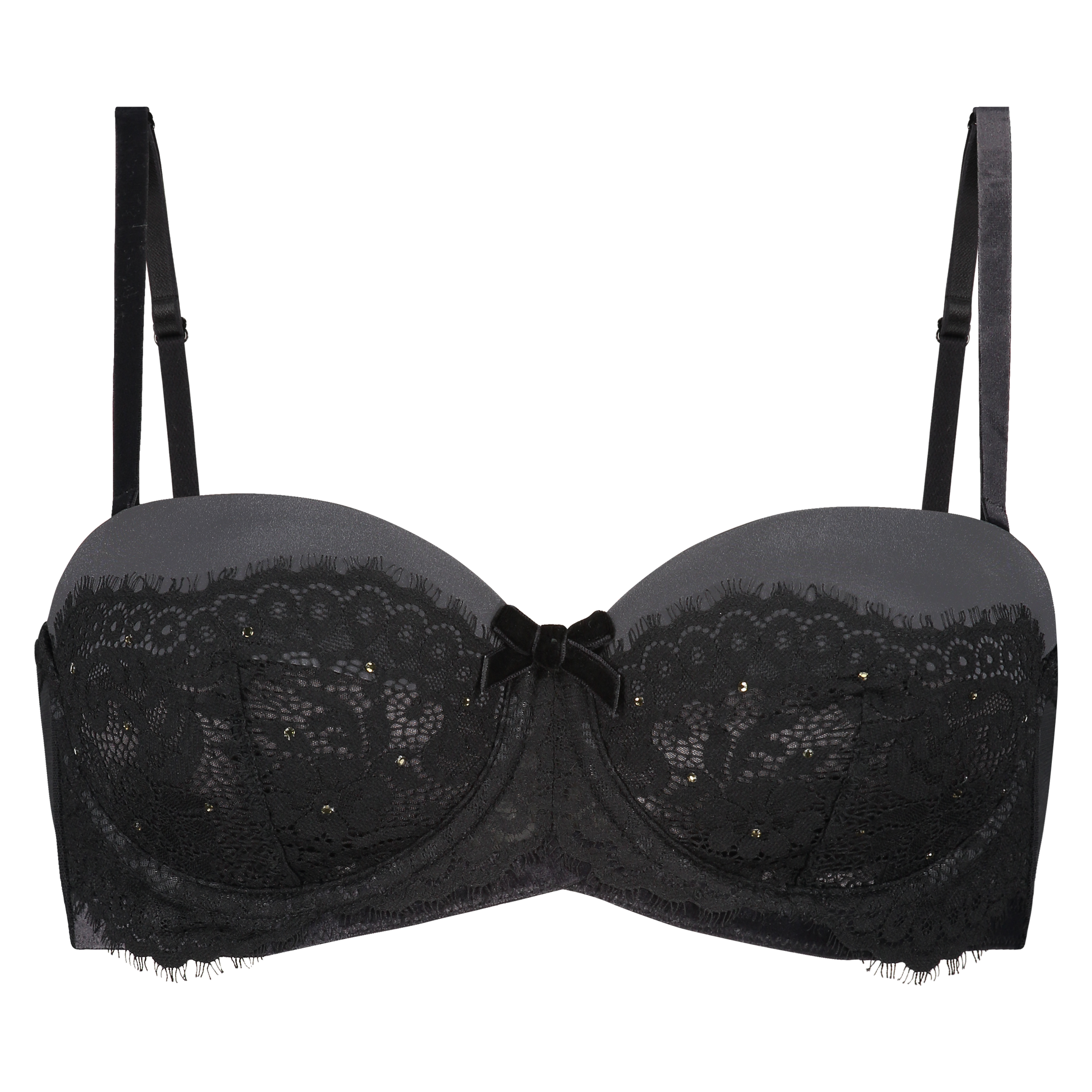 Denne BH-en er virkelig noe du bare må ha! Skålene er pyntet med blonder og bittesmå rhinstener. Det er en sløyfe i fløyel mellom skålene. Kan brukes med eller uten stropper. Kombiner med matchende ting for å få et fullstendig sett.