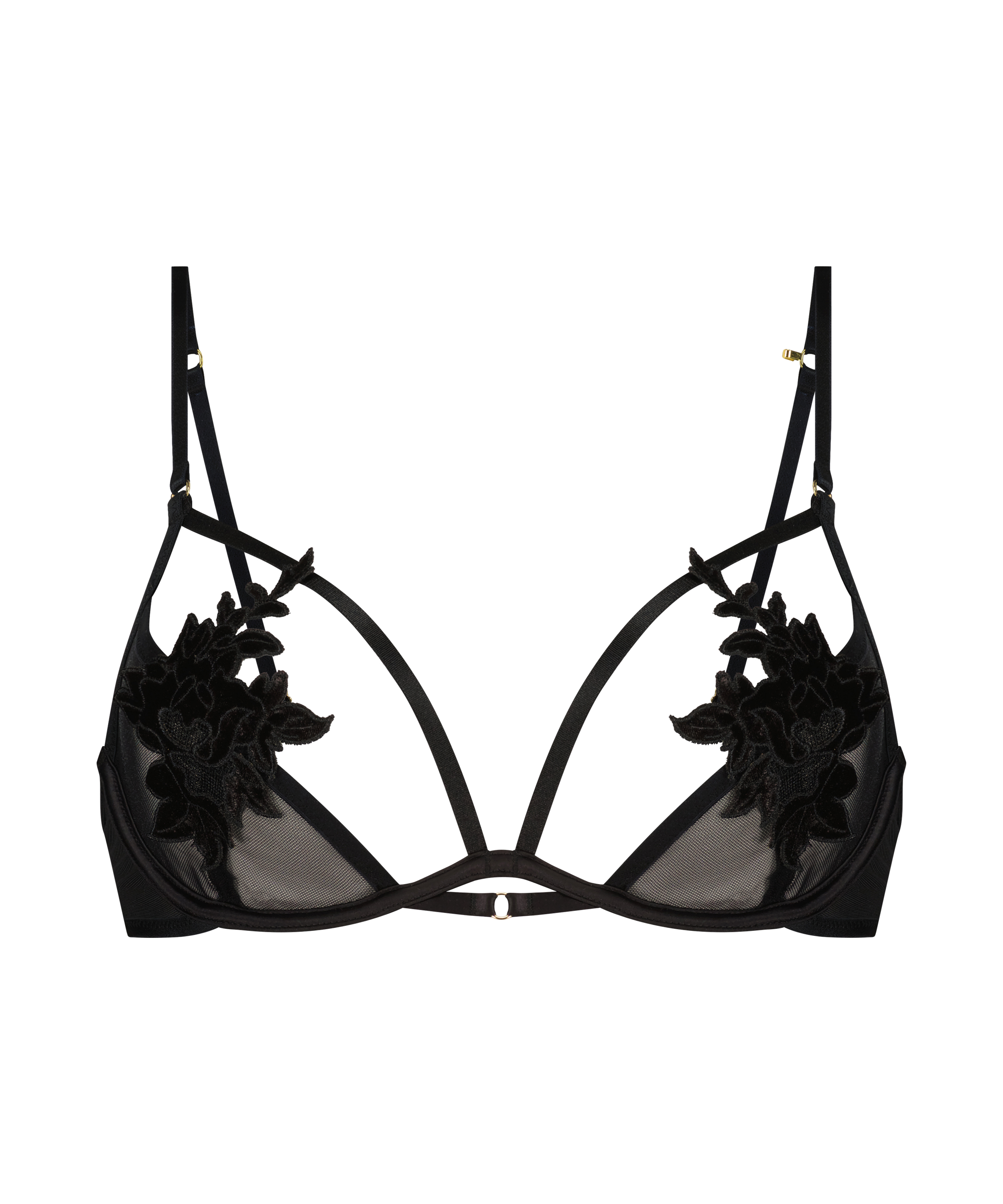 Med denne sexy BH-en vil du føle deg feminin umiddelbart! Det er velourblomster foran på cup'ene. Kombiner med matchende plagg fra Private-kolleksjonen for et komplett undertøysett!