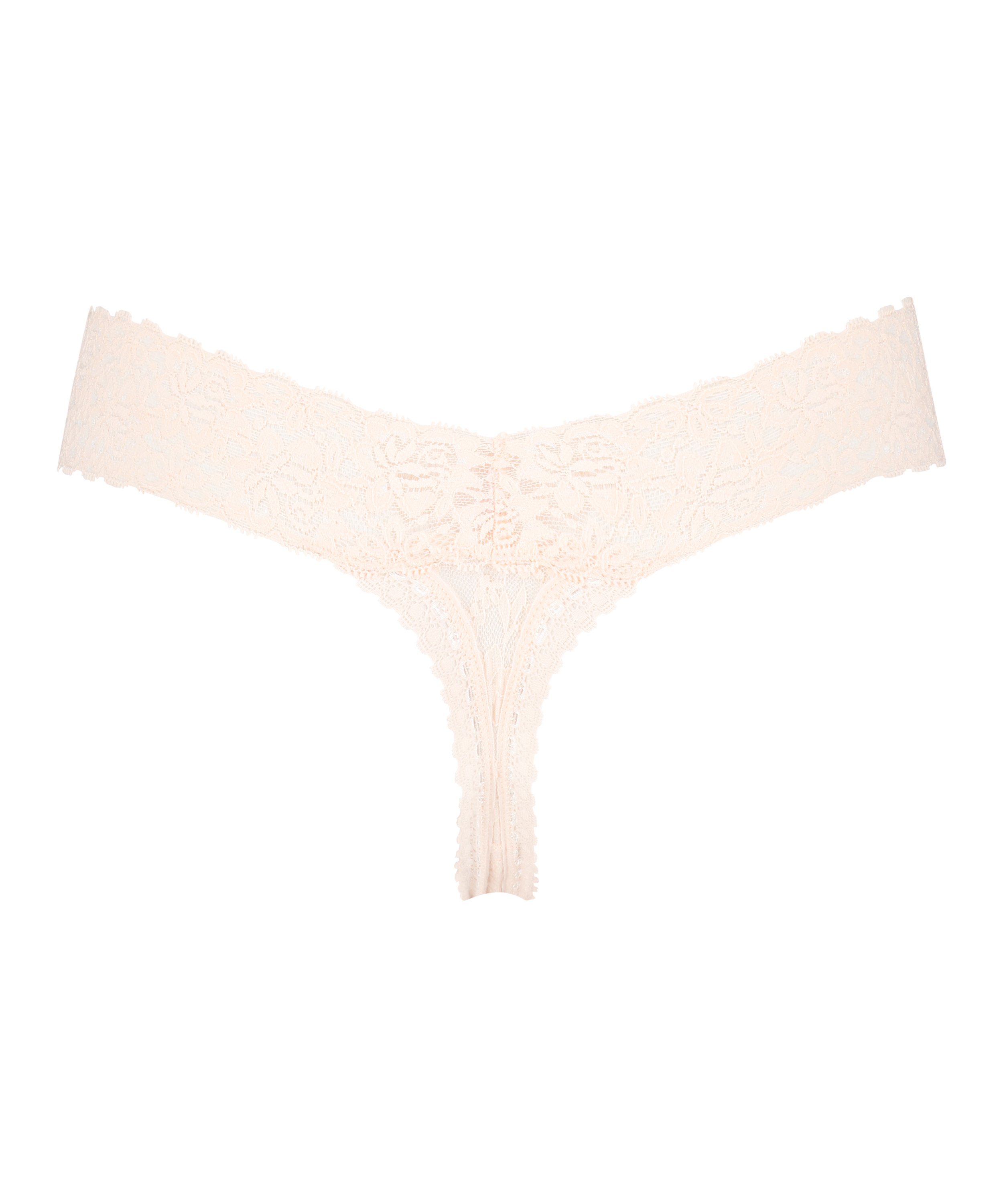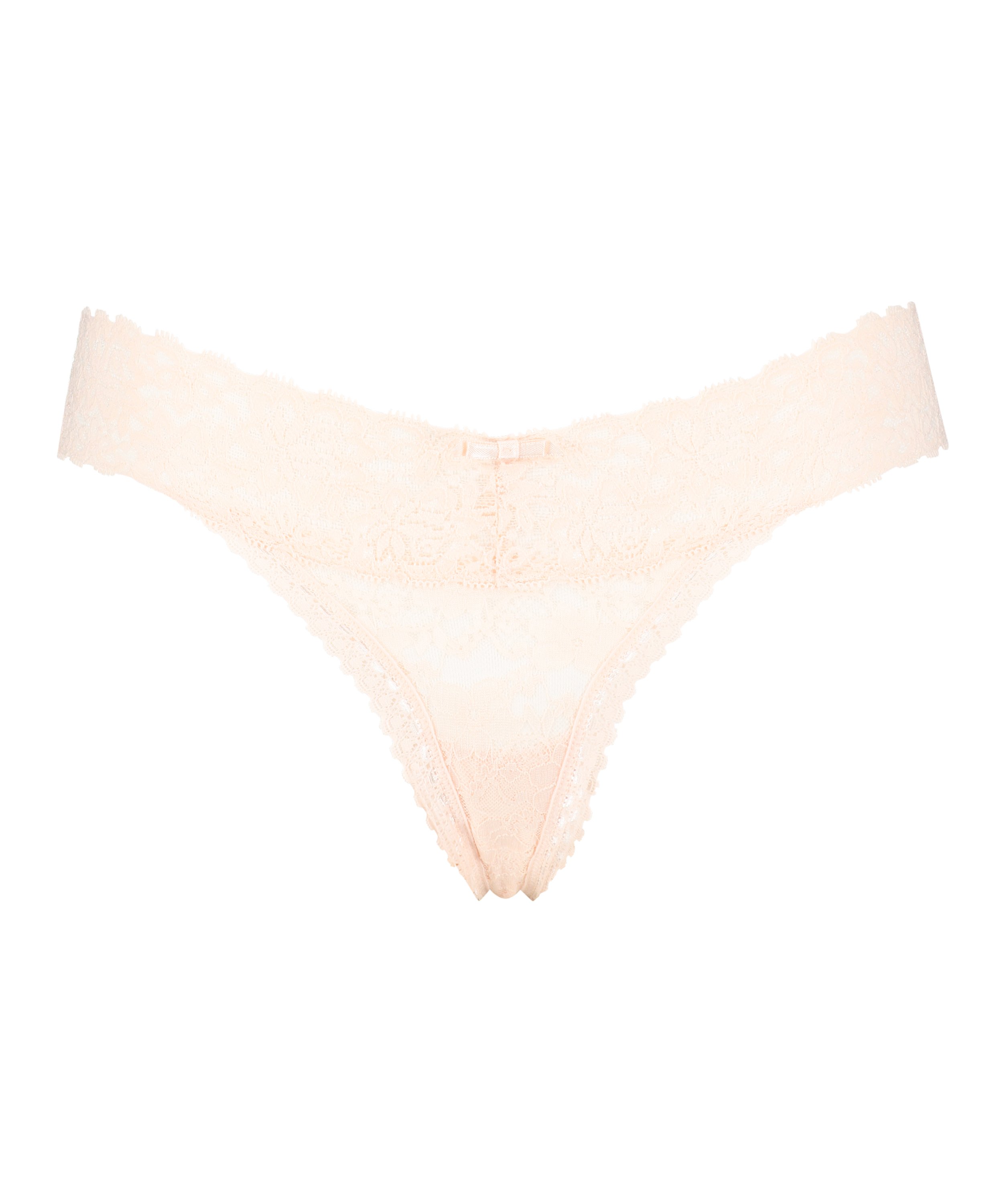 Bli med på blondebølgen! Denne ekstra lave V-thongen er laget av blondestoff og pyntet med en liten sløyfe.