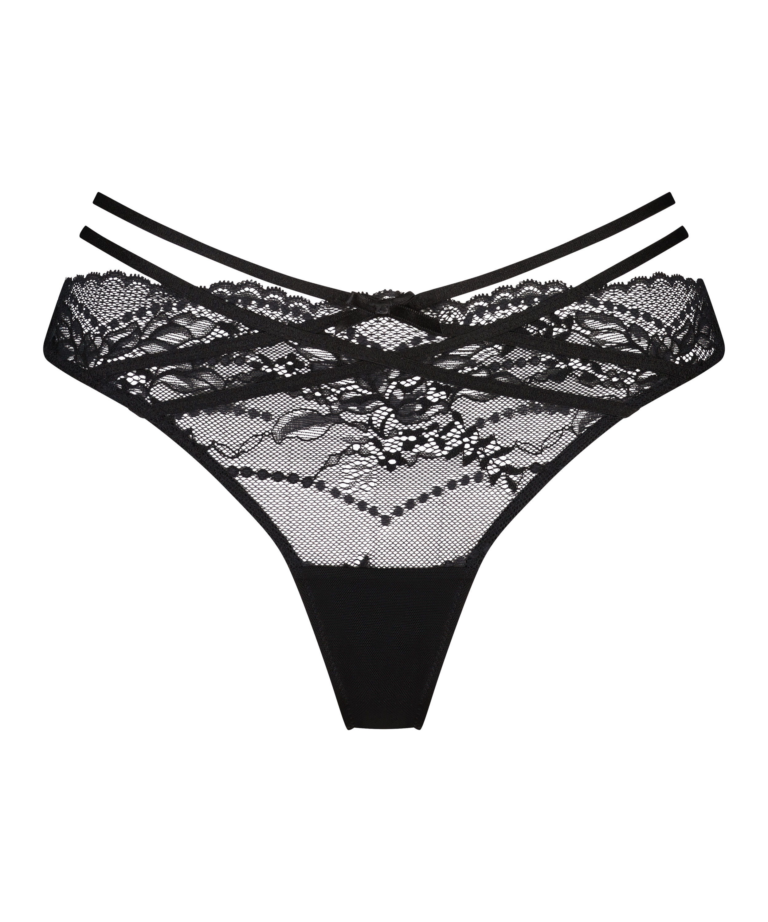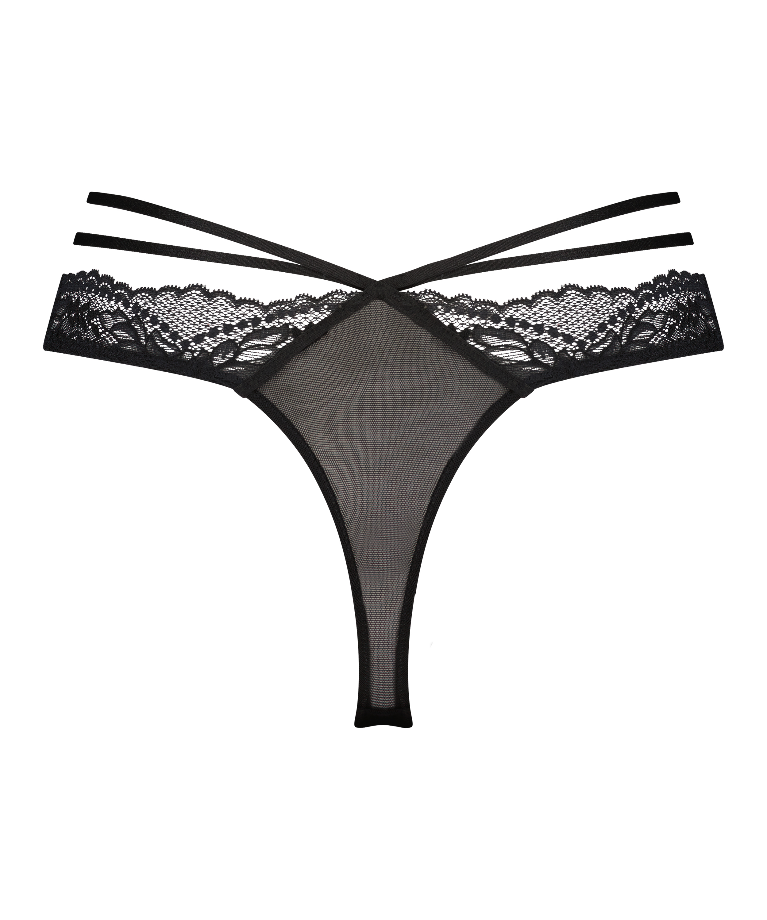 Ikke gå glipp av denne flotte thongen! Med semi-transparent look foran og brodert design. Sammen med stropper foran og på sidene for en ekstra sexy look. Mykt stoff er brukt i skrittområdet for best mulig komfort. Finish med søt sløyfe foran. Miks og match med en BH!
