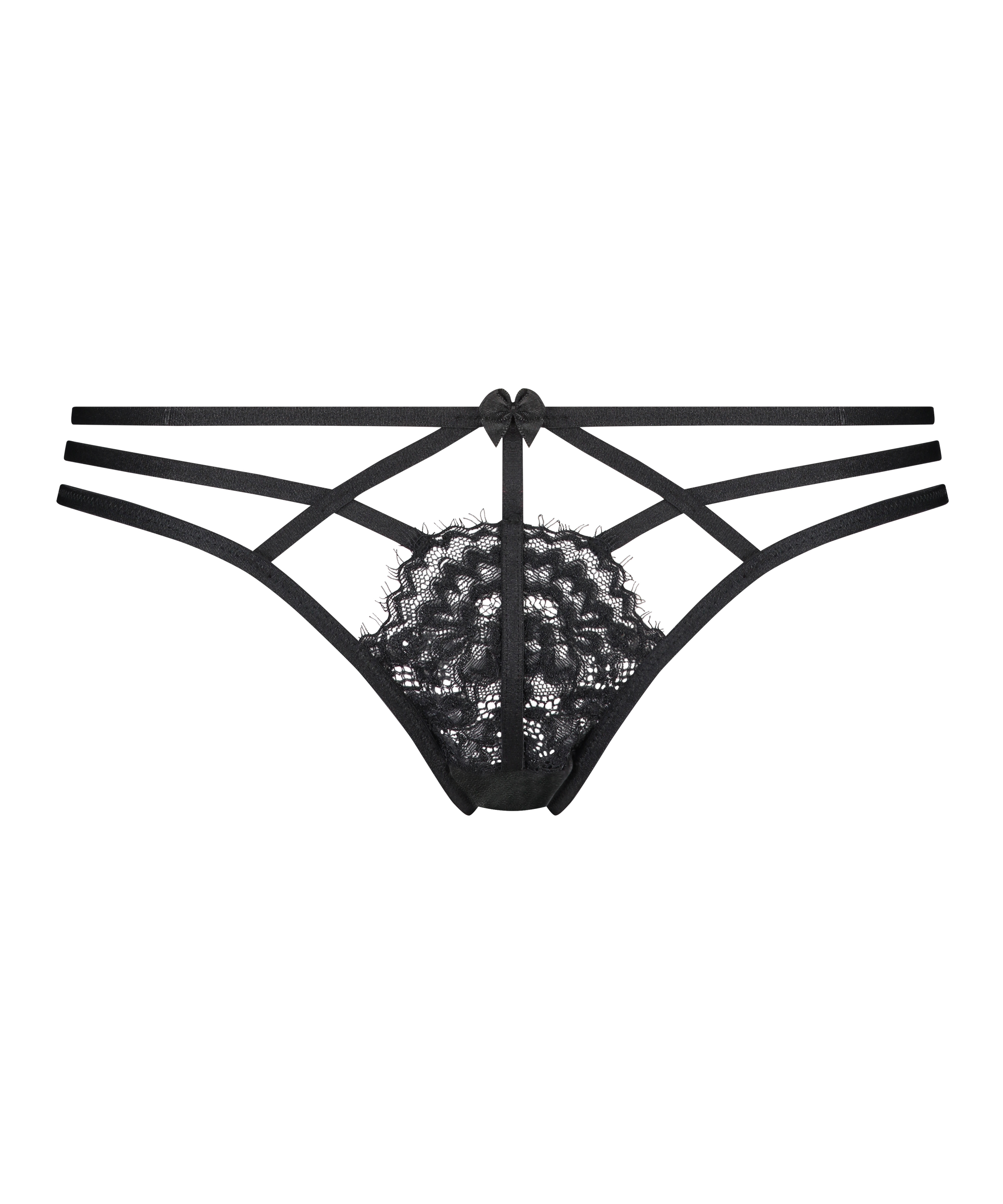 Denne thongen både ser ut og kjennes som sateng med masse blonder. De dristige utskjæringene gjør thongen supersexy. Dekorert med sløyfe foran. Kombiner med matchende plagg for å få et komplett sett. Fra vår Private-kolleksjon.
