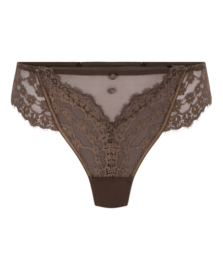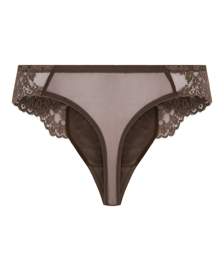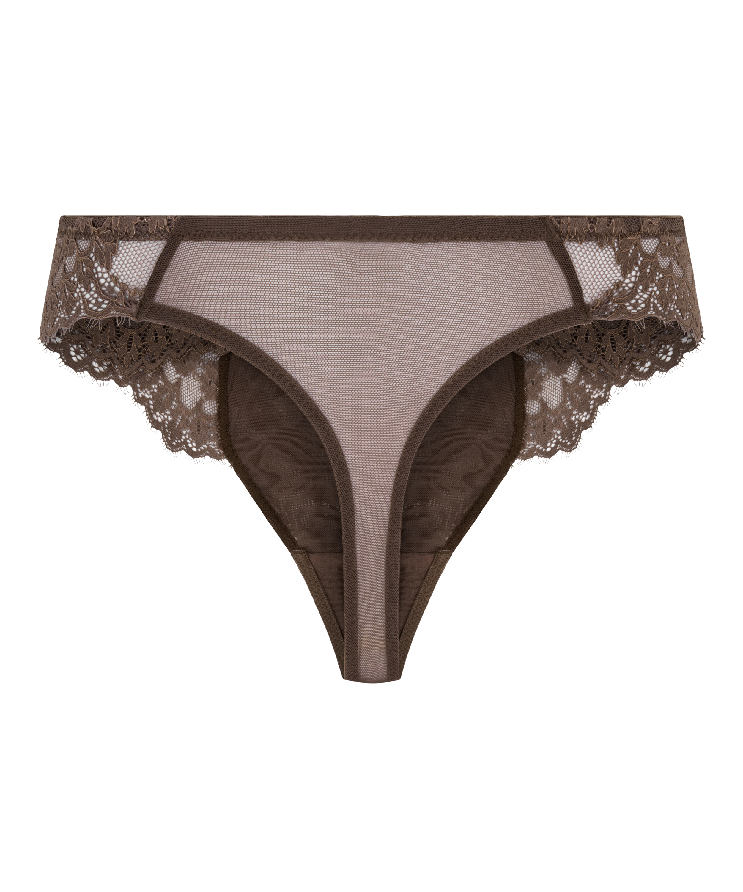 Denne trendy thong har en gjennomsiktig blonde foran og en mesh bak. En liten knapp midt foran setter prikken over i'en.