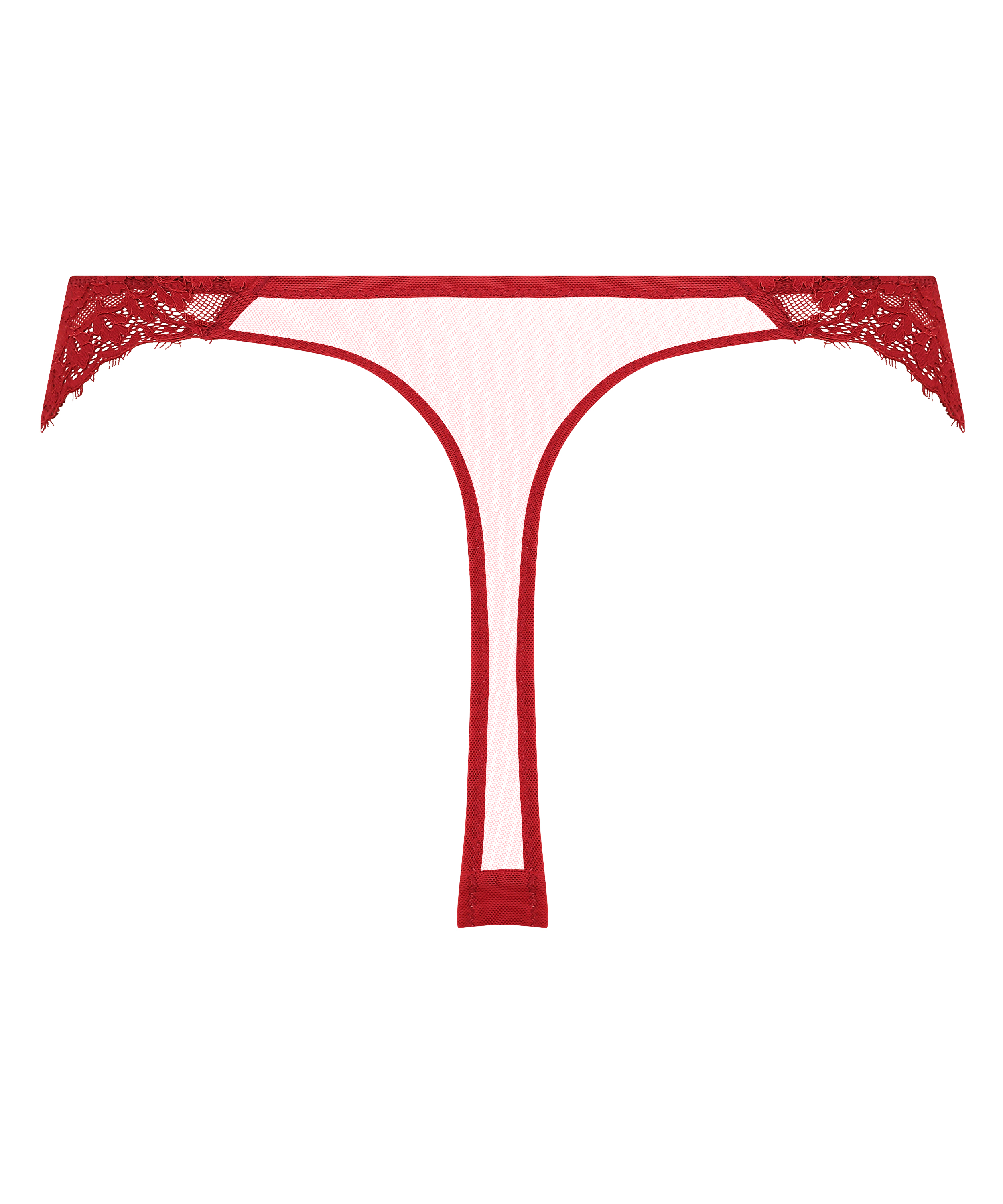 Denne trendy thong har en gjennomsiktig blonde foran og en mesh bak. En liten knapp midt foran setter prikken over i'en.