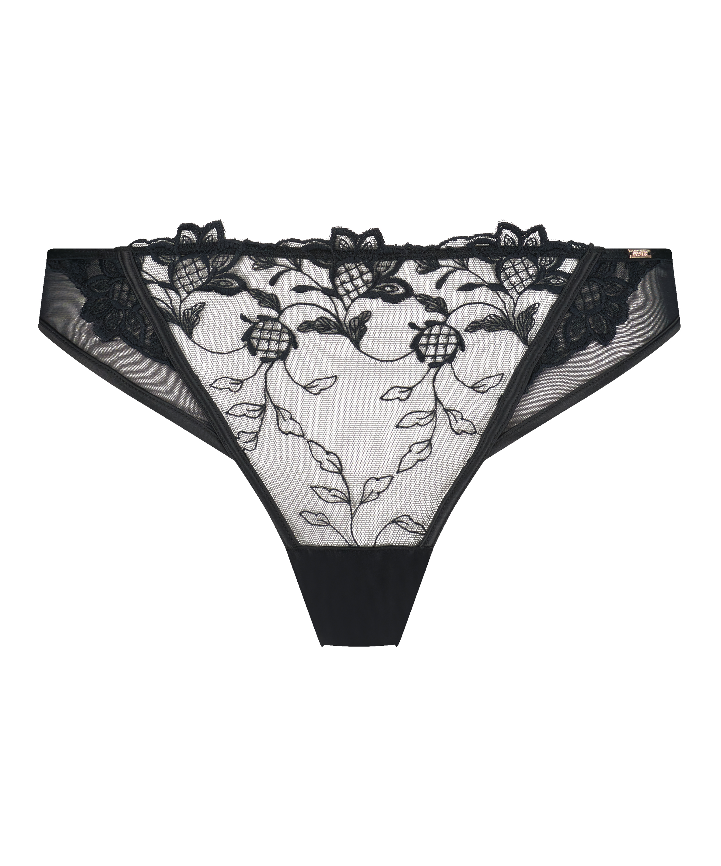 Føl deg elegant i denne nydelige g-strengen! Med en semi-transparent, sexy look over det hele og broderier, blonder og nettingdetaljer foran og bak. Kombiner med matchende BH for å komplettere settet! En del av vår Noir-kolleksjon.