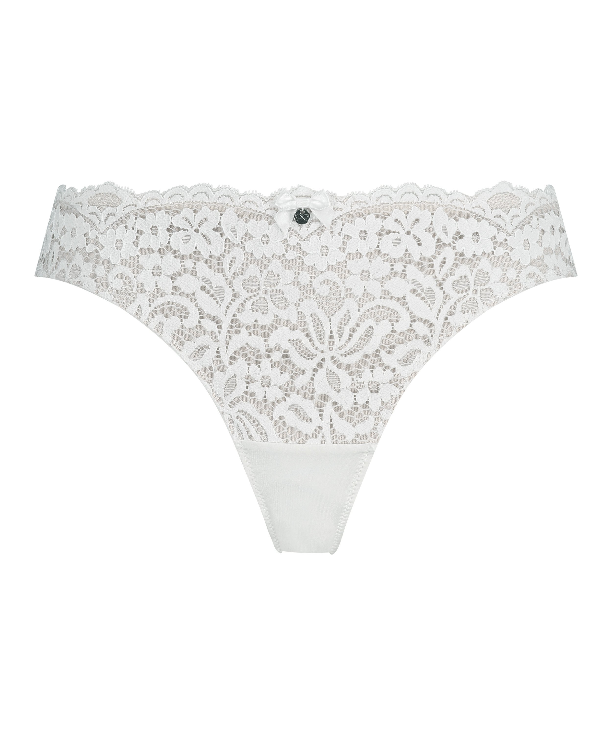 Du vil se søt ut i denne thong! Den har blonder helt over med et blomstermønster og er avsluttet med en liten sløyfe i midten. Kombiner med matchende BH for en komplett look.