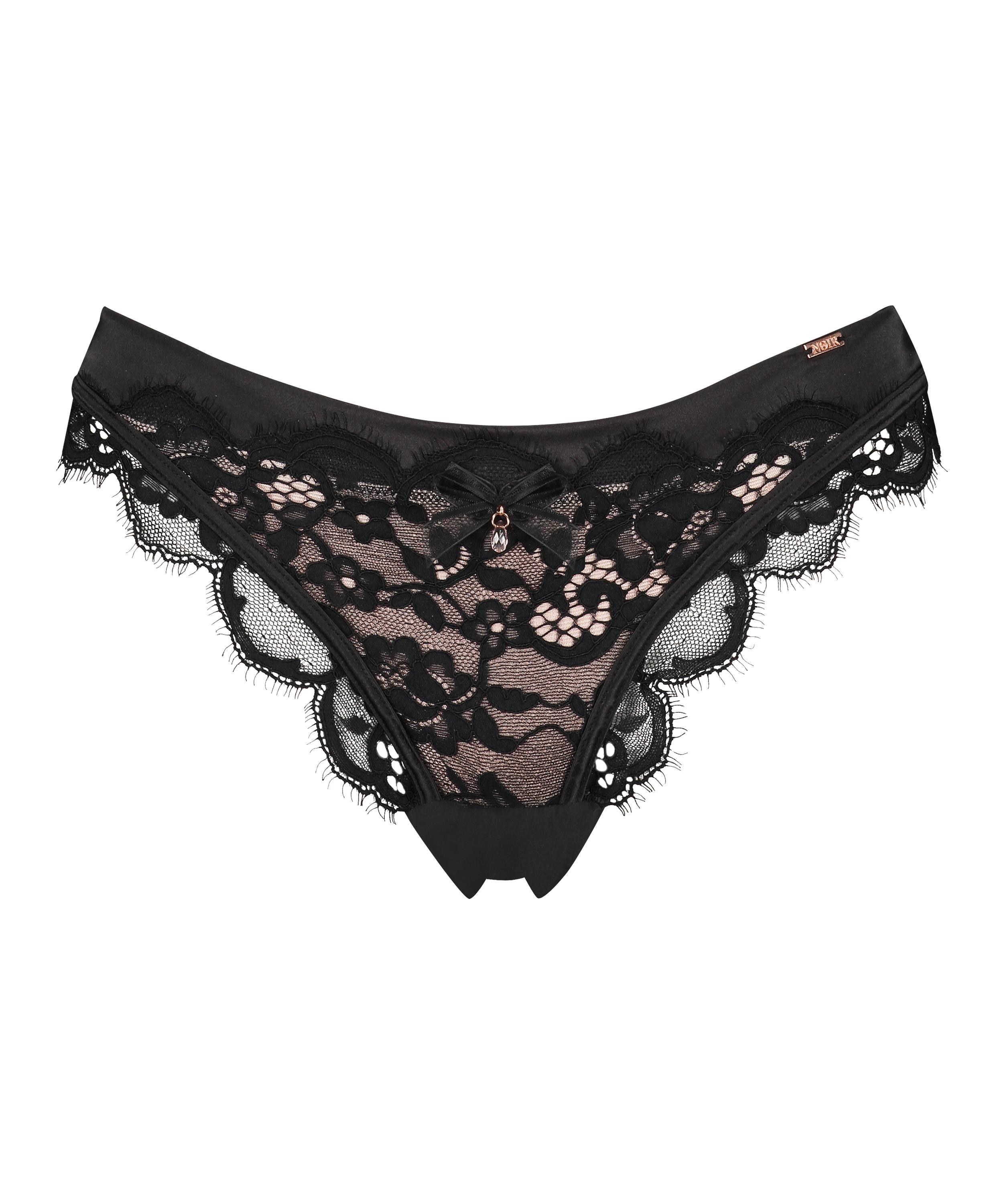 Denne brasilianske trusen har stoff som ser ut og kjennes som sateng, og er pyntet med blonder. En liten sløyfe foran gir et avsluttende feminint preg. Den har mesh på baksiden for å få stussen din til å se ekstra nydelig ut. Fra vår Noir-kolleksjon