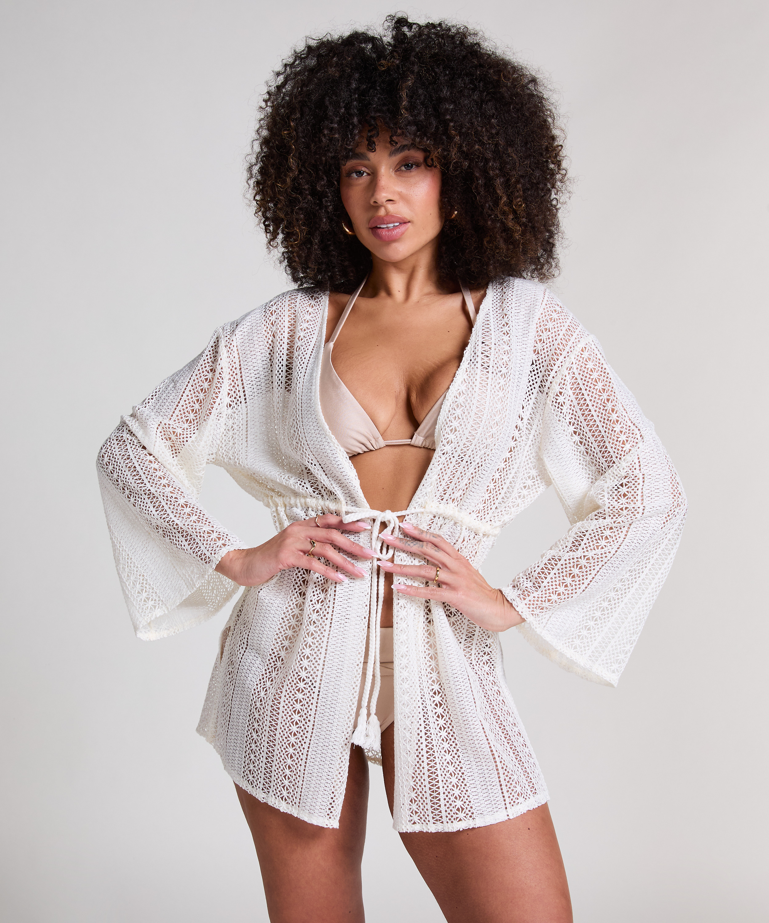 Dette strandtilbehøret er et must i sommer! Fullt laget med heklet mønster og en snor til å knytte rundt livet. Bruk den over din favorittbikini eller badedrakt.