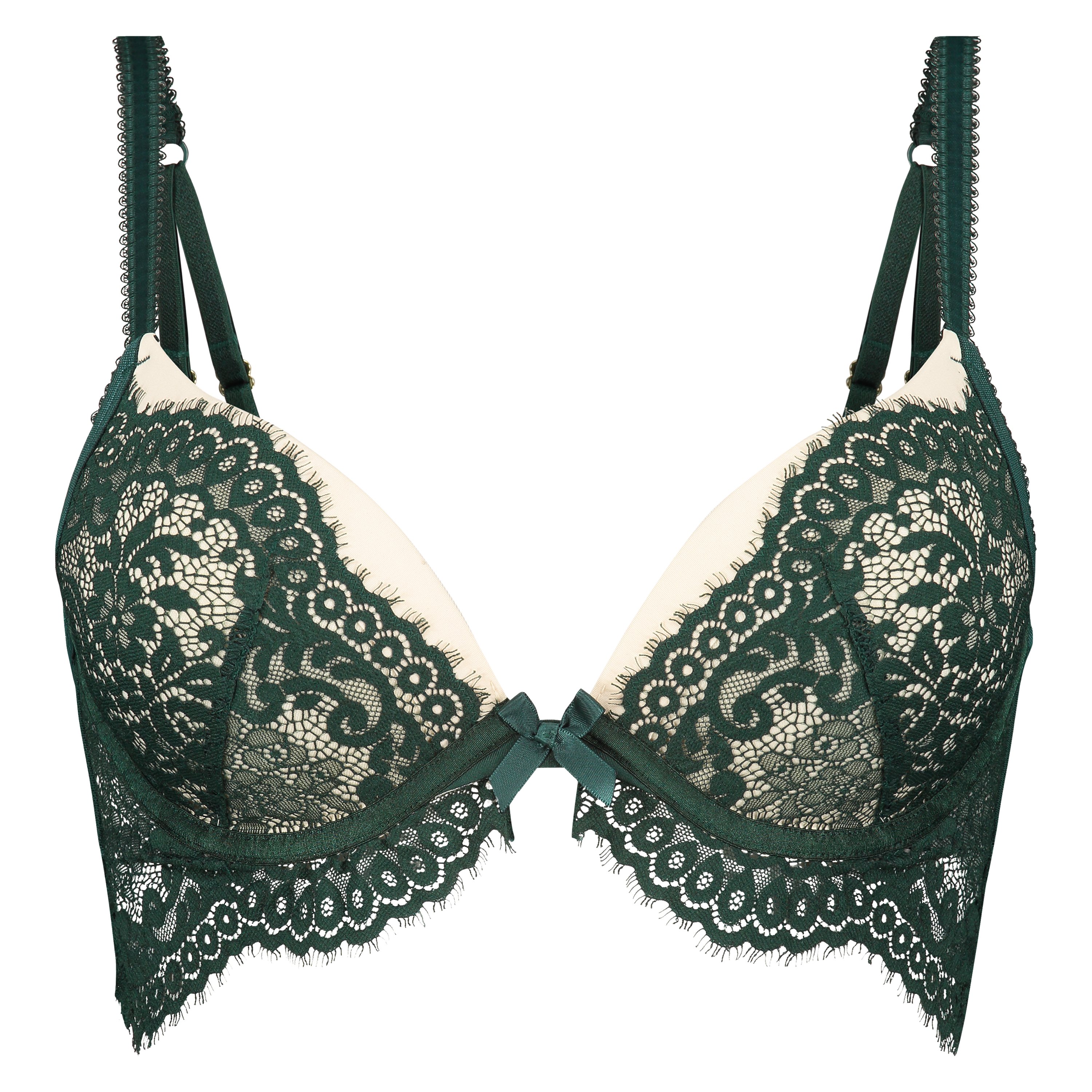 Utringningen din blir virkelig fremhevet med denne pushup-BH-en! Skålene er pyntet med blonder. Blondene strekker seg nedenfor skålene: supersexy! Foran er det en sløyfe midt på. Kombiner med den matchende trusen og få et fullstendig sett.