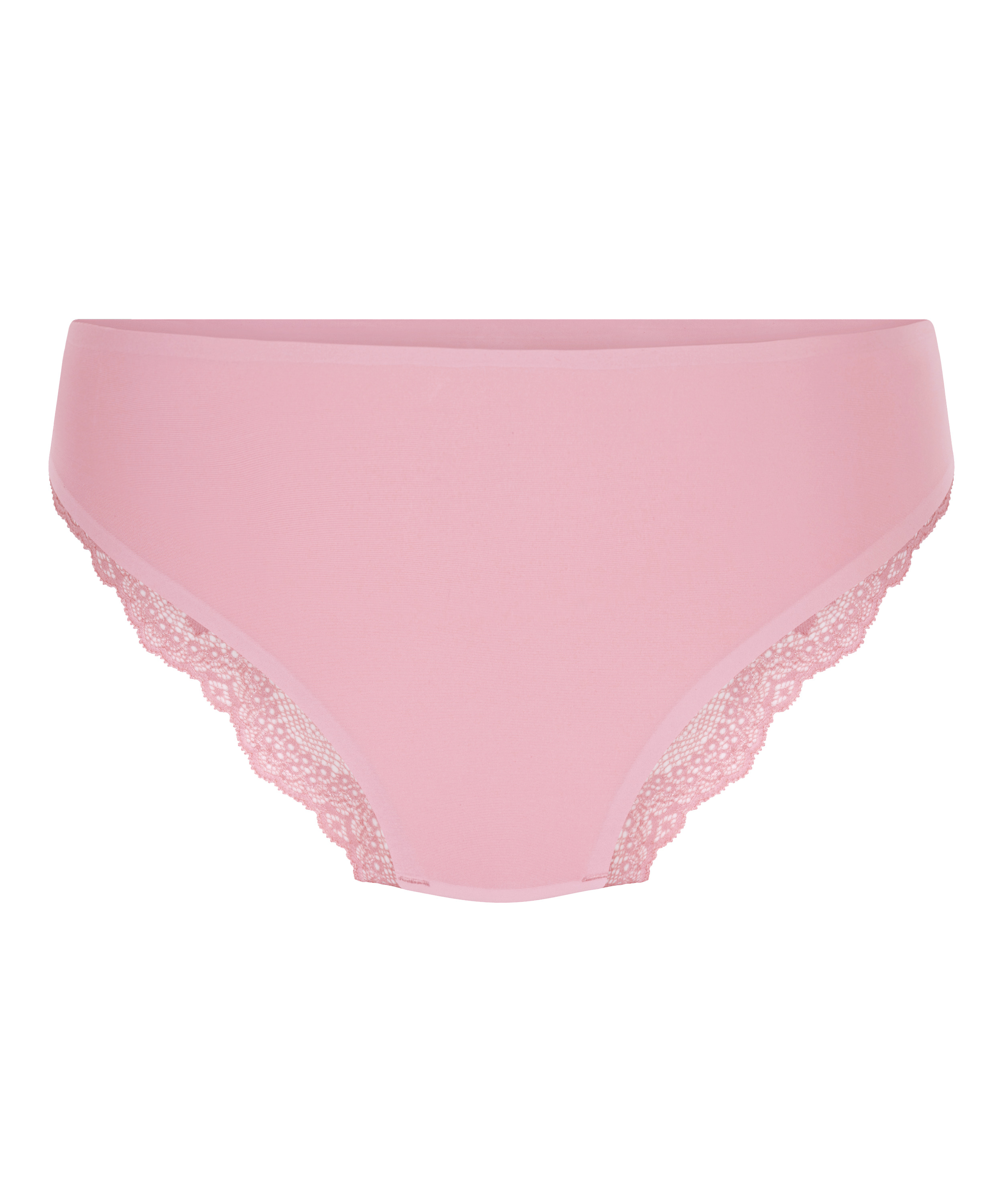 Denne brasilianske underbuksen er sømløs, så den vises ikke gjennom trangtsittende klær. Blondene bak gir den et sexy utseende.