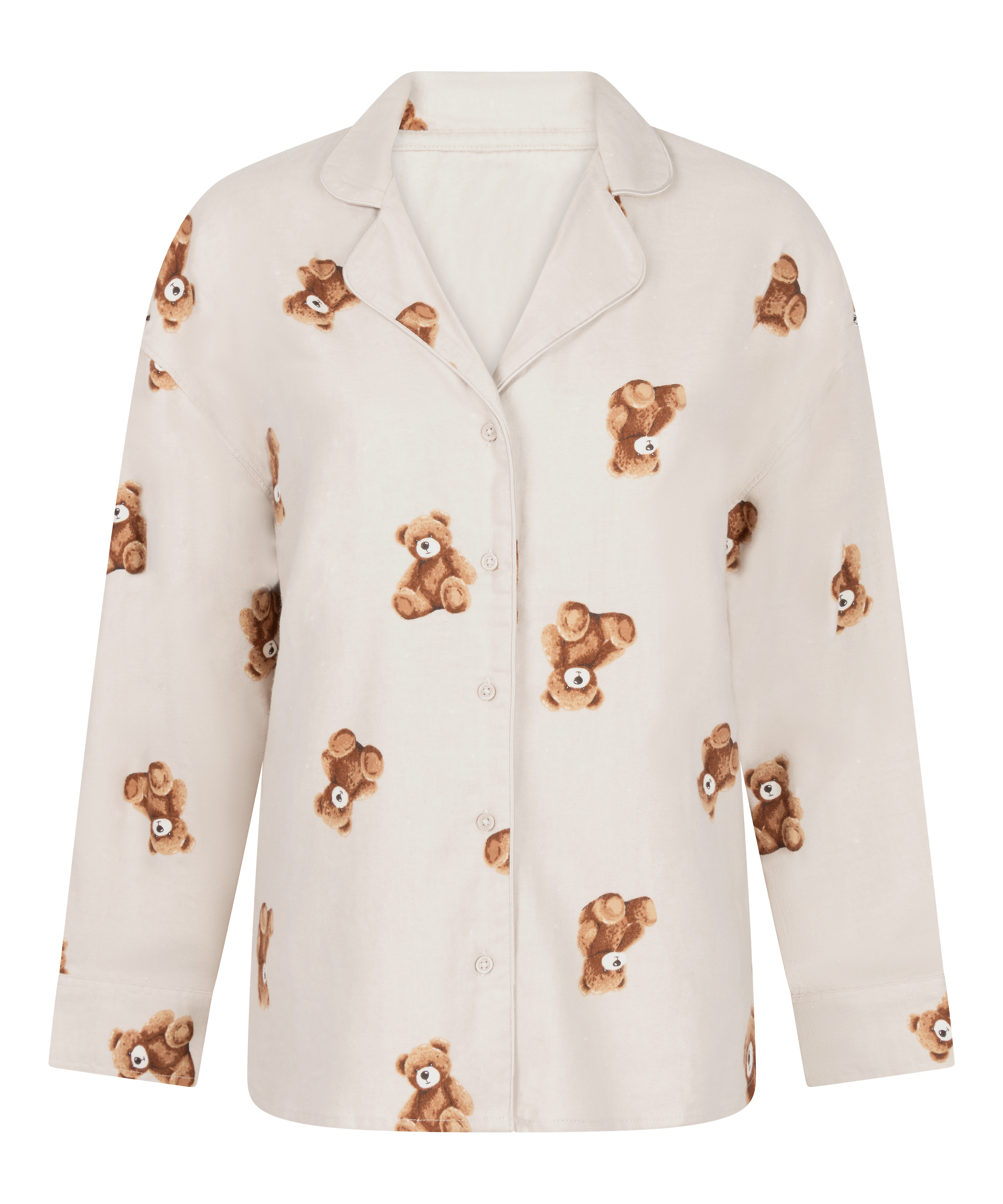 Omgi deg med varme med denne sjarmerende pyjamasjakken – laget for kvelder hjemme og late morgener. Den er laget av myk flanell-twill og har en klassisk krage, lange ermer og knapper hele veien ned foran, noe som gir den et tidløst utseende. Det lekne bjørnemønsteret gir en morsom og koselig touch som du vil elske å kle deg i. Den er perfekt for kjøligere kvelder, og kan kombineres med matchende underdel for et komplett antrekk.