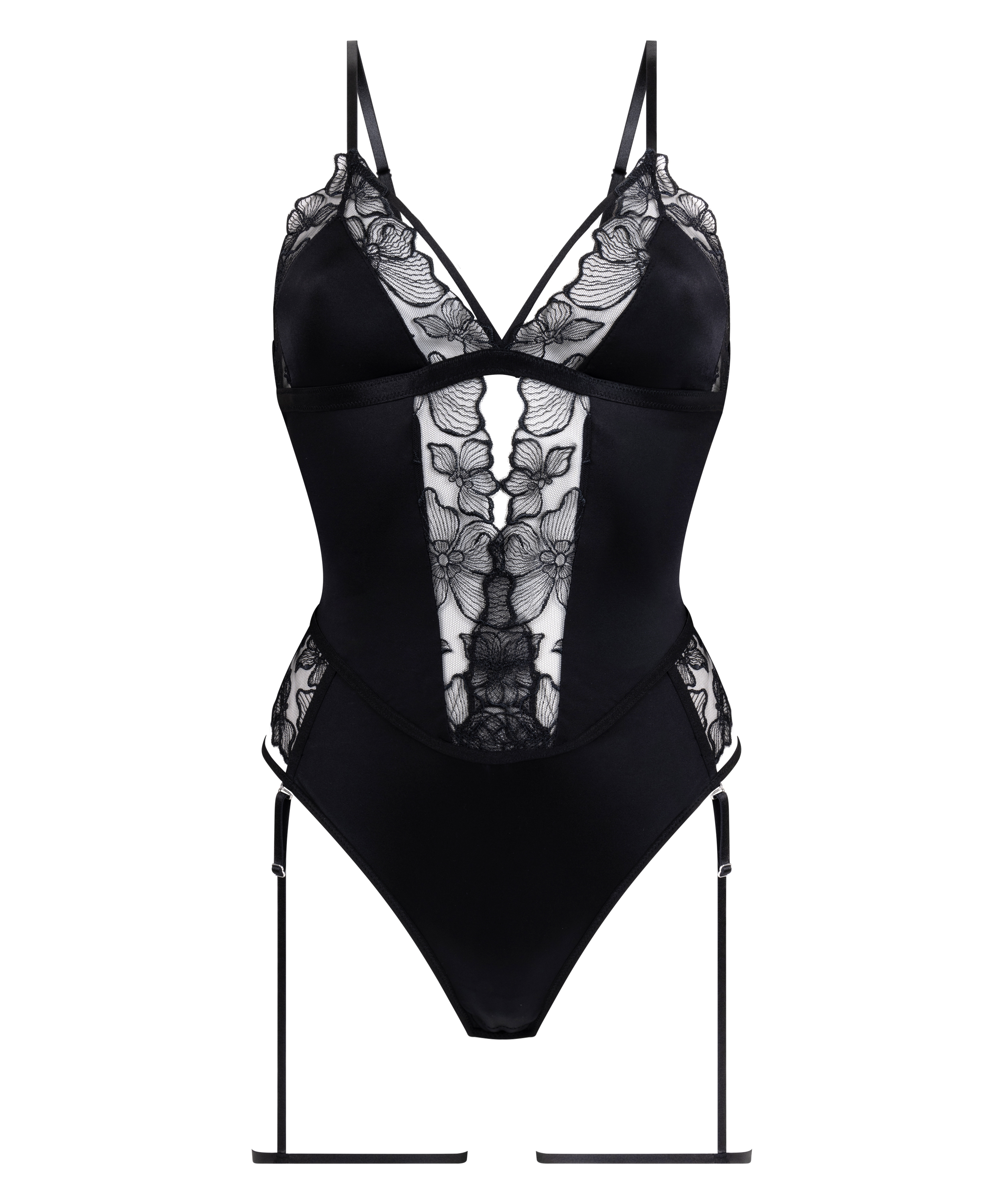 Bli enda mer forførende i vår body, et dristig og elegant valg, laget for å vekke oppsikt. Ved å kombinere delikate blonder og silkeaktig sateng, gir denne bodyen deg en luksuriøs følelse og et fengslende utseende. En utskåret detalj foran gir den en fin touch. Det avtakbare strømpebåndet gir deg flere stylingsalternativer, slik at du enkelt kan justere utseendet.