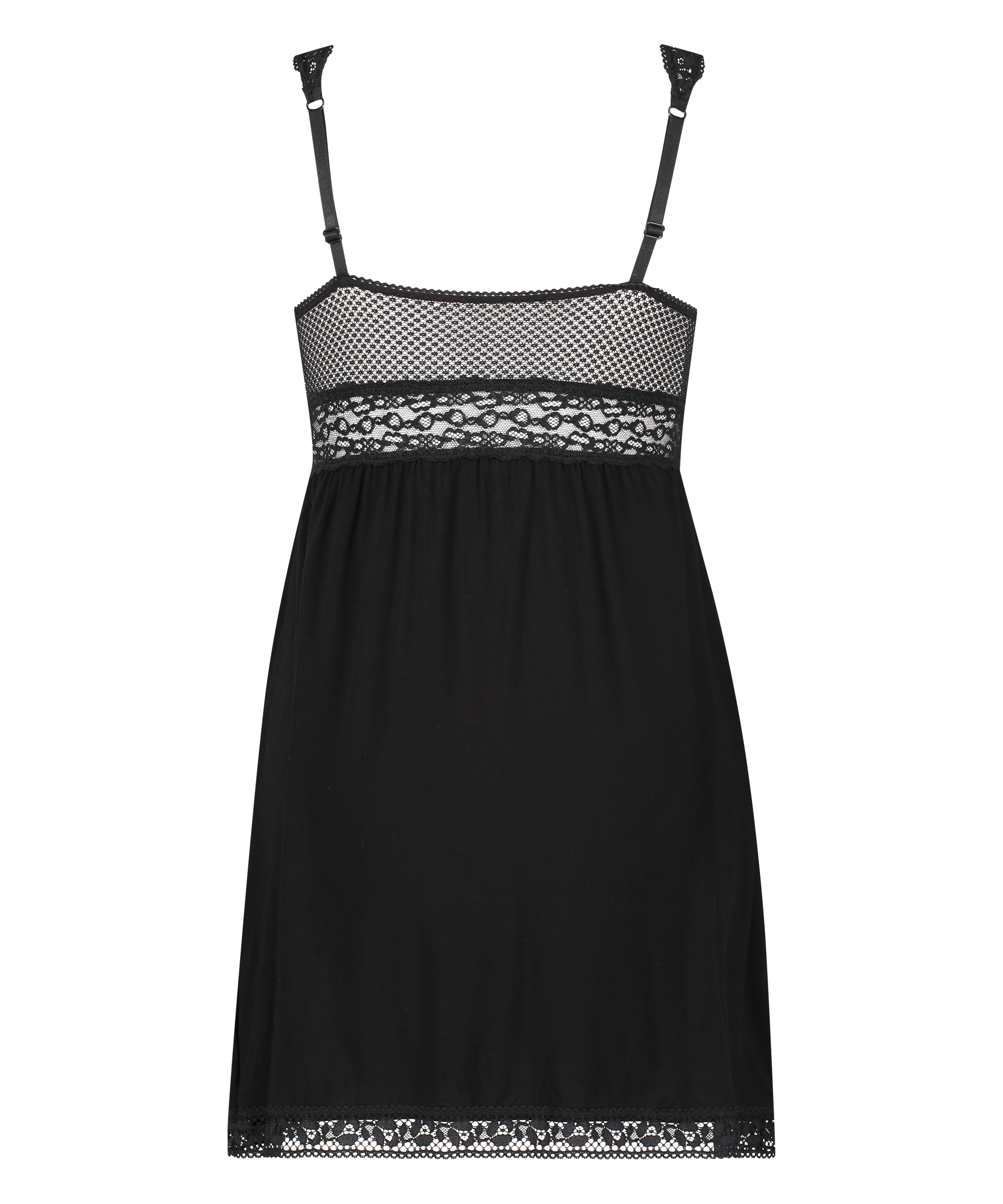 Denne slipkjolen er en flott tilvekst i garderoben din! Den har en dyp v-hals og blondedetaljer. Nydelig å ha over det sexy undertøysettet ditt!
