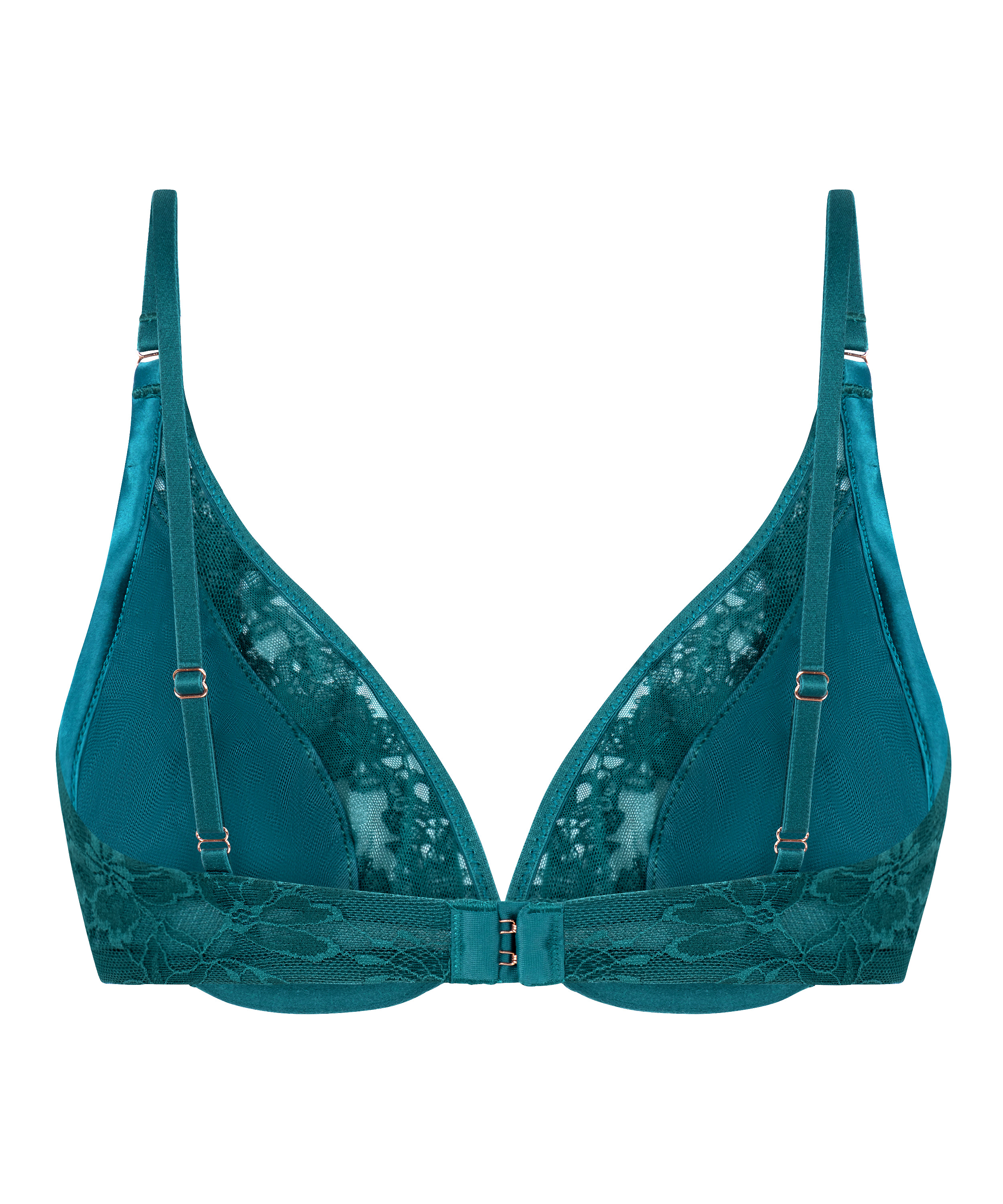 Delikat, dristig og vakkert detaljert – denne upolstrede plunge-BH-en er laget av myk blomsterblonder for en romantisk, nesten usynlig følelse. Den dype utringningen fremhever din naturlige figur, mens kroken på baksiden sikrer en sikker og behagelig passform. En subtil smykkeakcent foran gir et glimt av glans, noe som gjør den til det perfekte smykket når du ønsker å føle deg uanstrengt elegant.