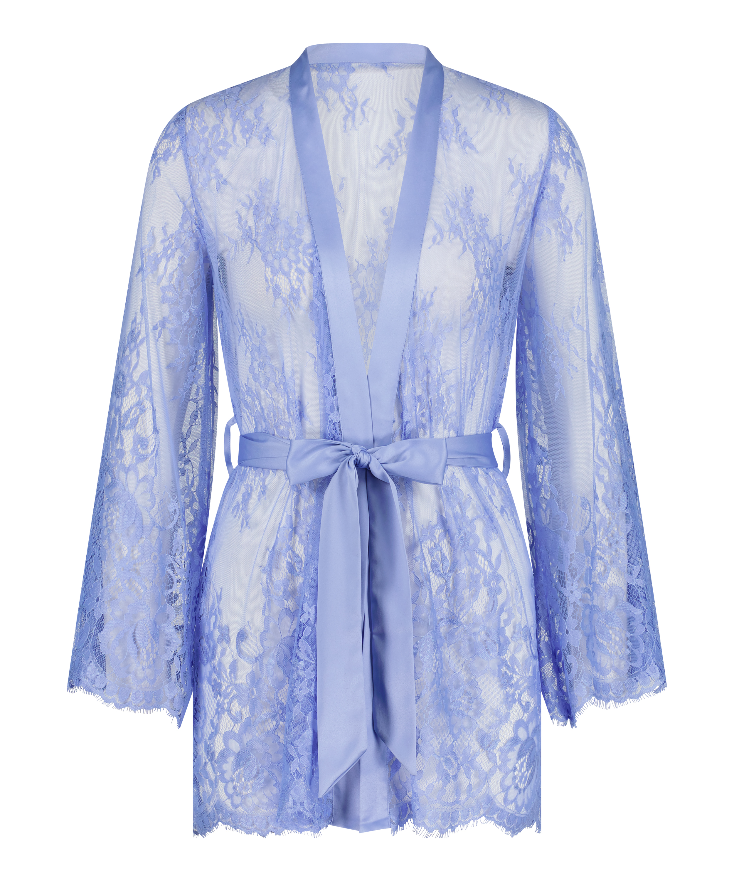 Denne kimonoen har det hele: sexy, feminin og masse blonder. Den er laget av gjennomsiktig blondestoff med sateng detaljer og har knepping foran.