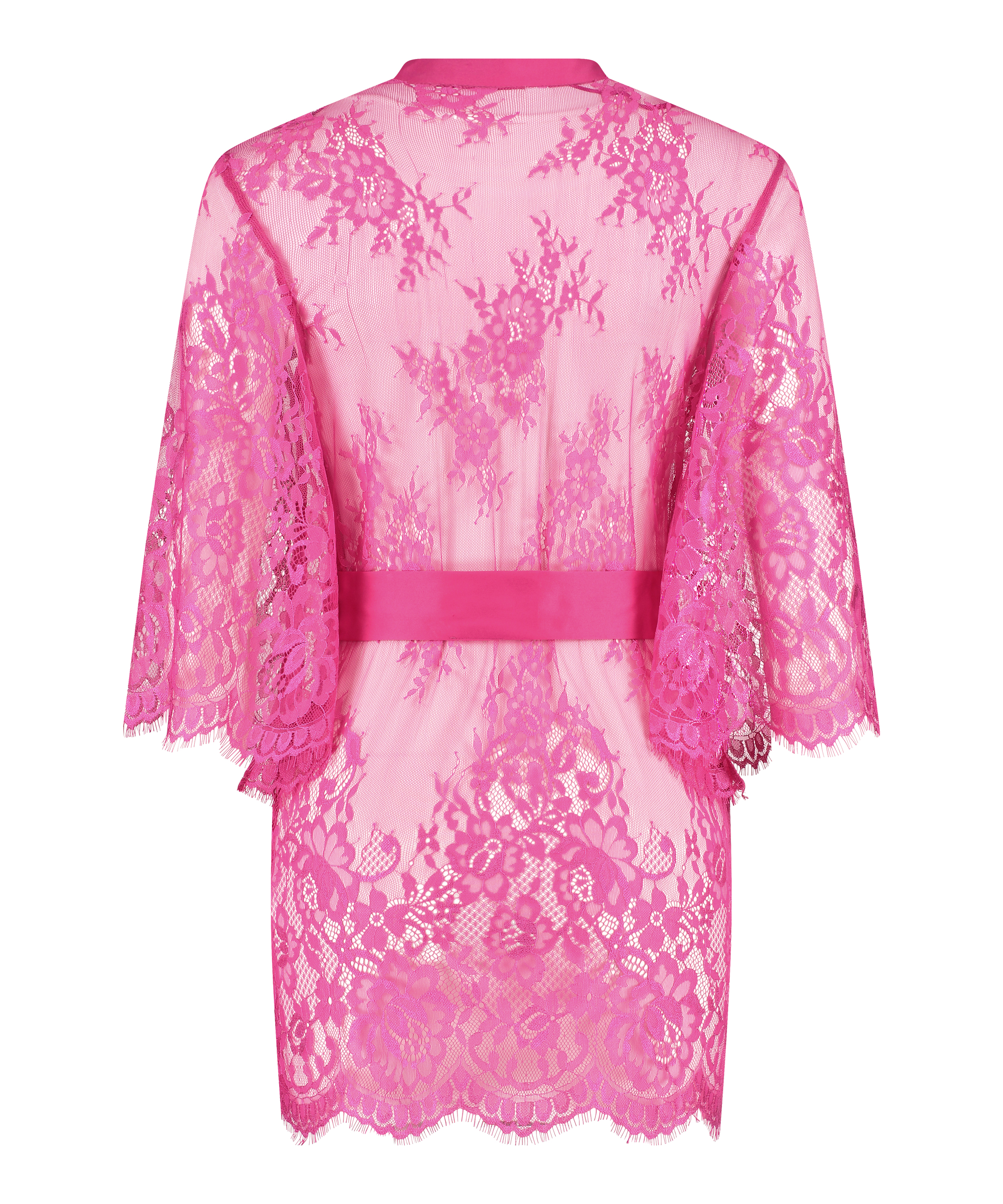 Denne kimonoen har det hele: sexy, feminin og masse blonder. Den er laget av gjennomsiktig blondestoff med sateng detaljer og har knepping foran.